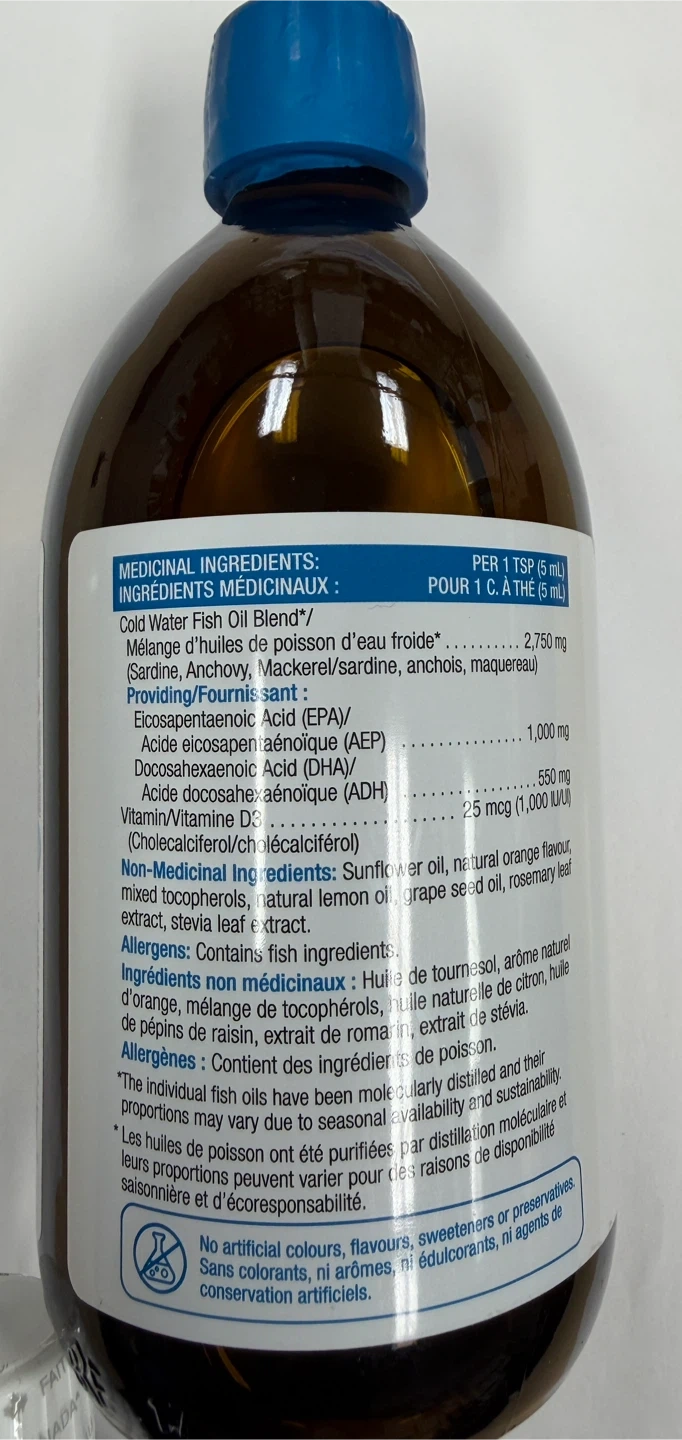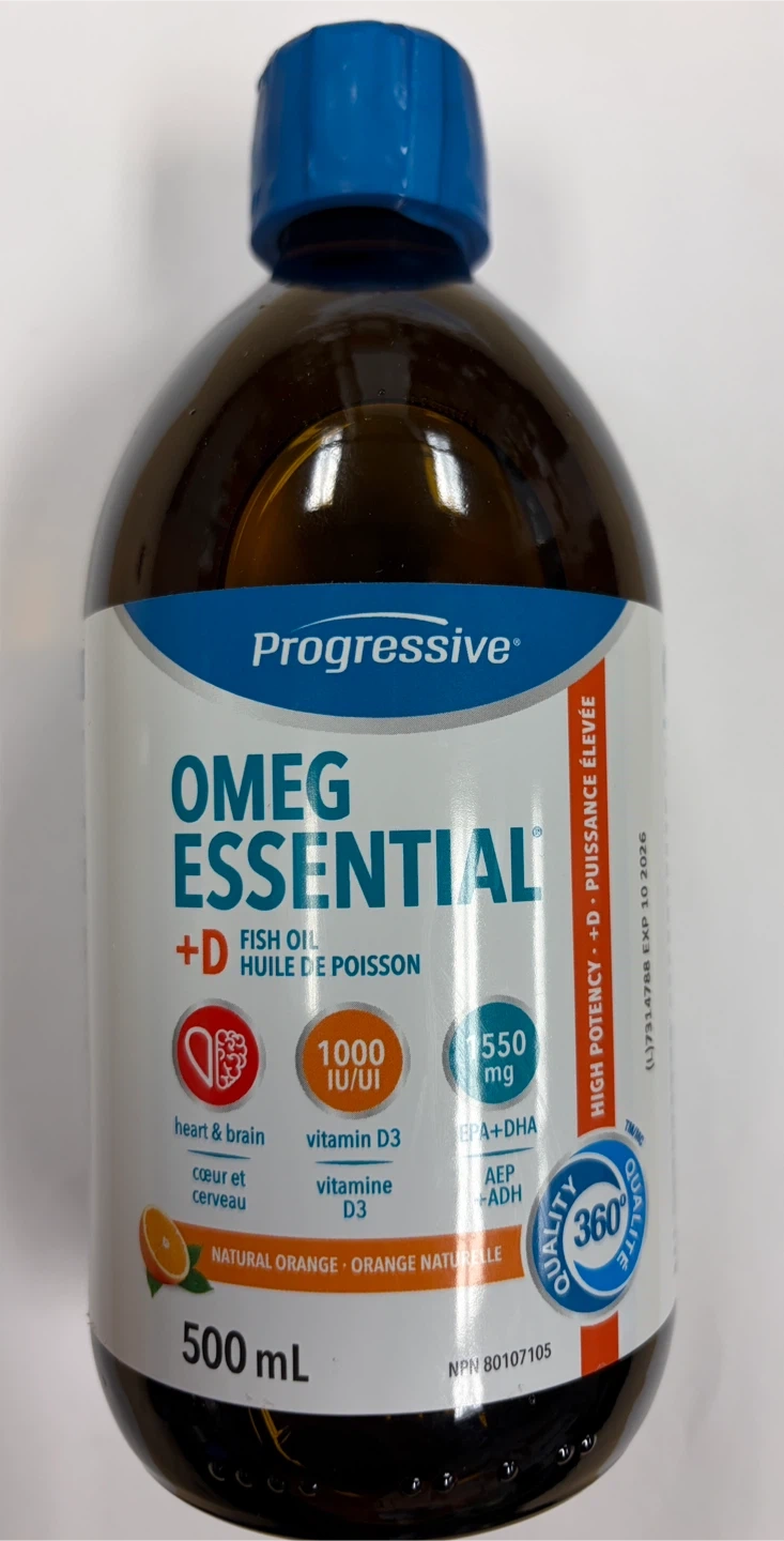 Progressive OmegEssential fish oil and vitamin D supplement comes in a 500 mL bottle. It's a natural orange flavour. This blend contains EPA and DHA. Use it to support heart and brain health. Expiry date is 2026-10.