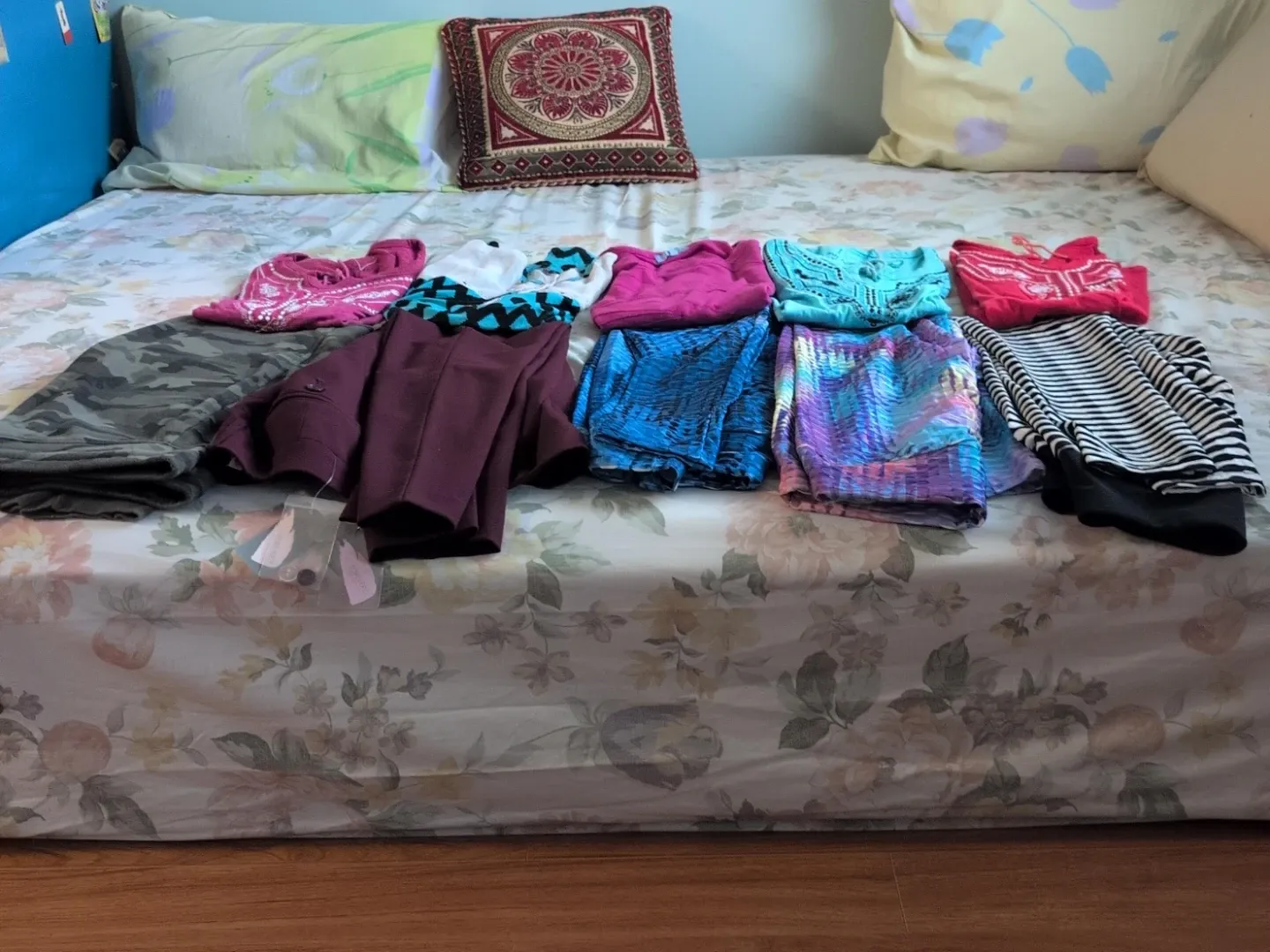 Bundle of women's clothing including patterned leggings, a maroon blazer, a pink top, a turquoise top, a red top, and striped pants. Multiple sizes and styles available. Great for refreshing your wardrobe!