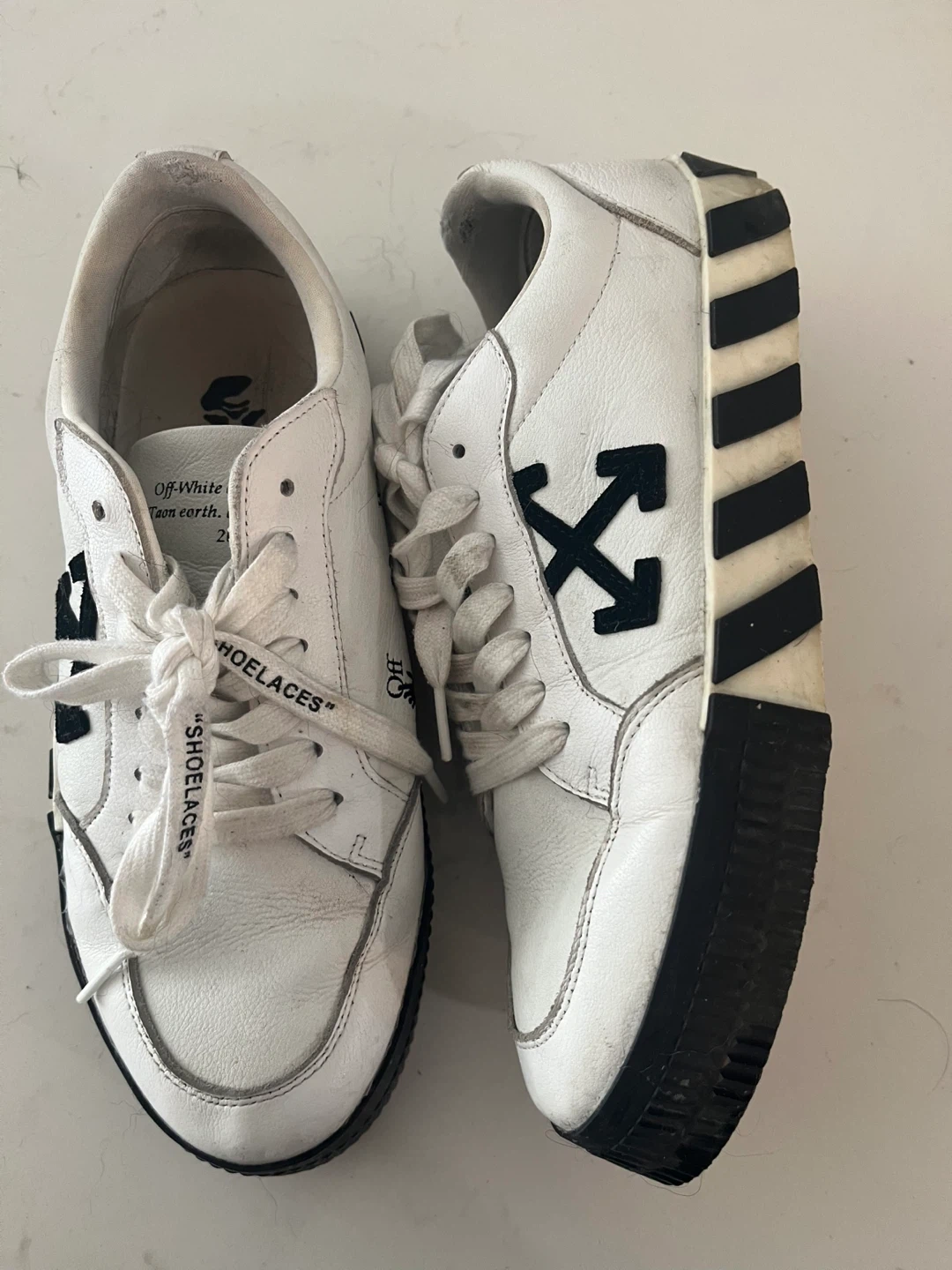 These are Off-White low top sneakers in white leather. They feature the signature Off-White diagonal stripes on the sole and branding on the sides. The laces are marked "SHOELACES".