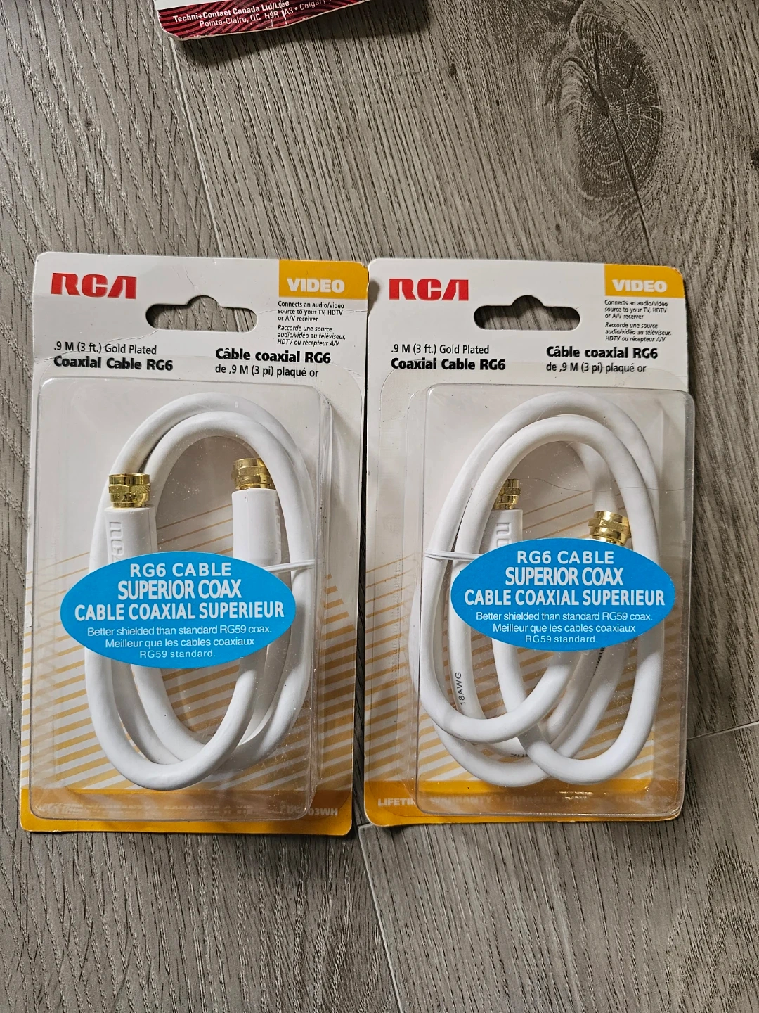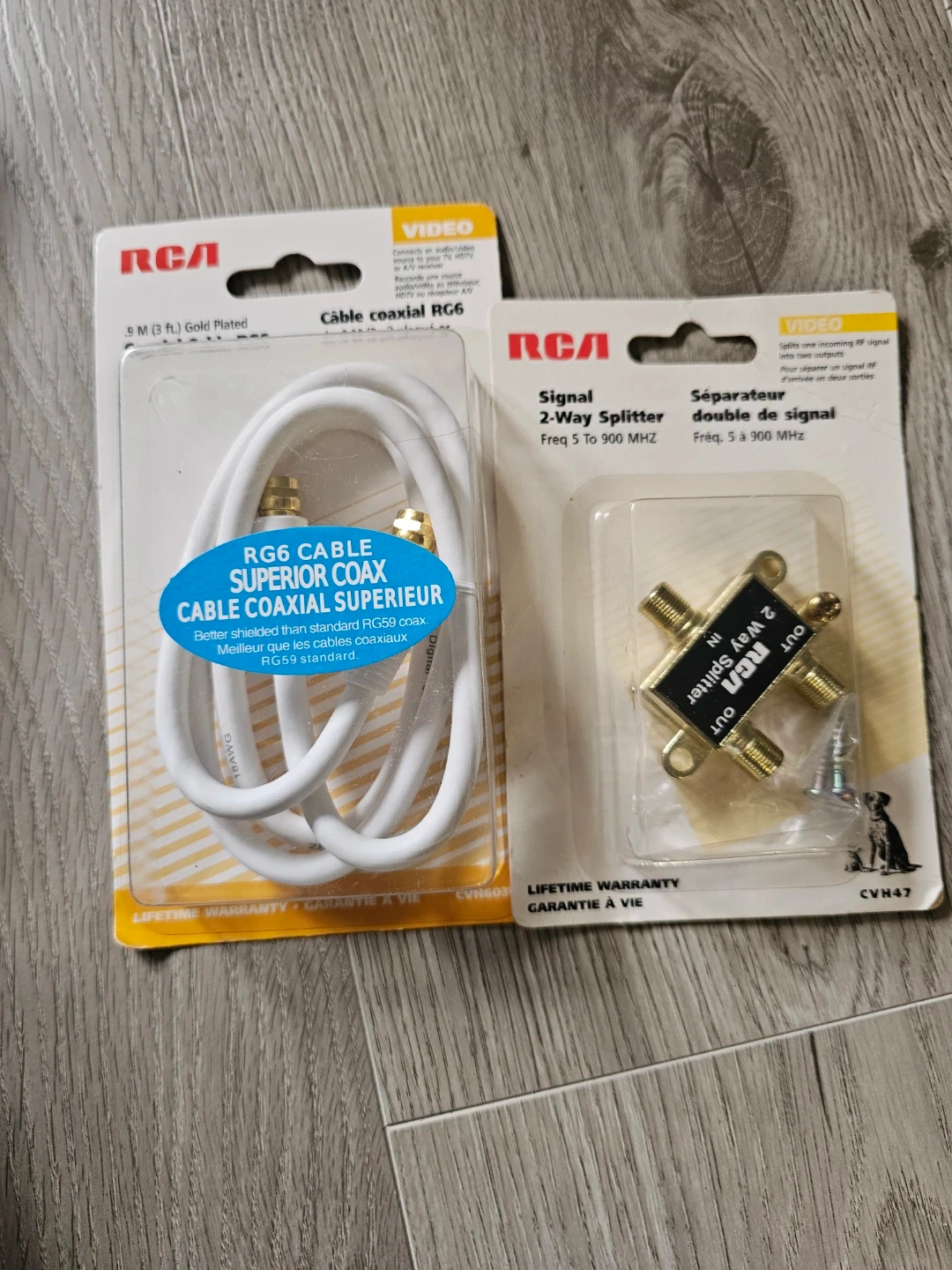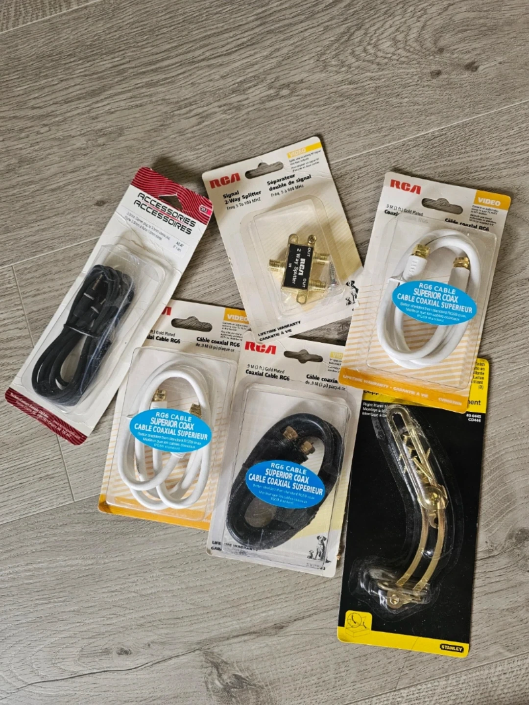 Includes two new RCA 9 M (3 ft) RG6 Gold Plated Coaxial Cables, one RCA 2-Way Signal Splitter (5-900 MHz), and a new Stanley Bright Brass Friction Lid Support. Also a new 3.5mm Stereo to 3.5mm Stereo Cable is included. It's great for home entertainment setups!