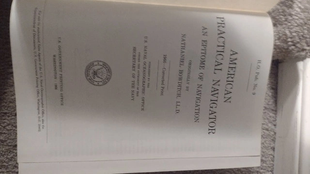 This is a 1966 corrected print of the American Practical Navigator, originally by Nathaniel Bowditch. It is an encyclopedia of marine navigation and a must-have handbook for mariners, coastal pilots, captains, and navigators. The publication is known as "Bowditch" and is carried on the bridge of every U.S. Navy ship. It covers both modern electronic navigation and non-electronic methods like celestial navigation and dead reckoning. The book includes formulas, solutions, calculations, useful tables, and a maritime glossary. 1524 pages. Condition: Used - Good. For Sale By: Owner. Cash accepted.