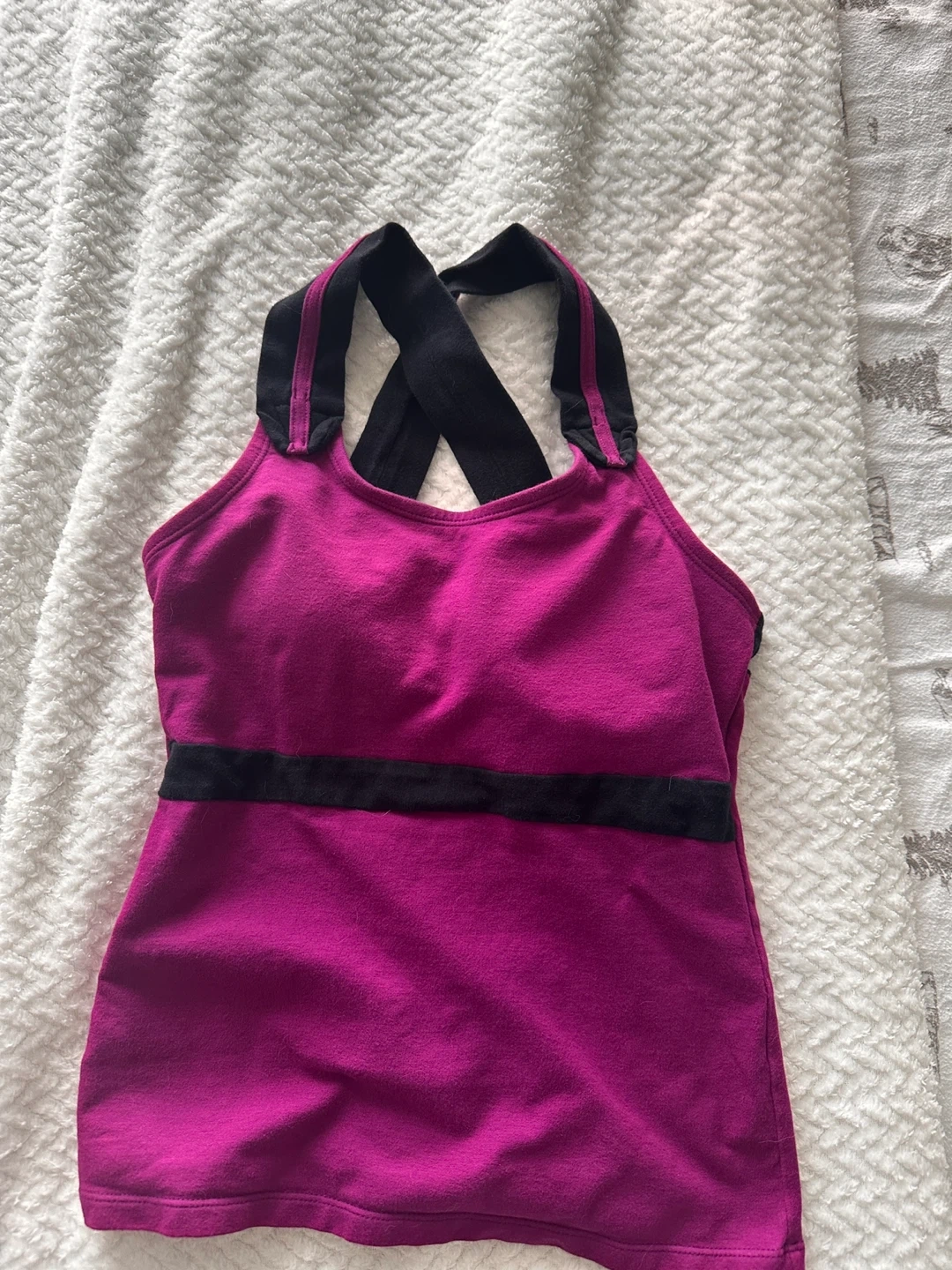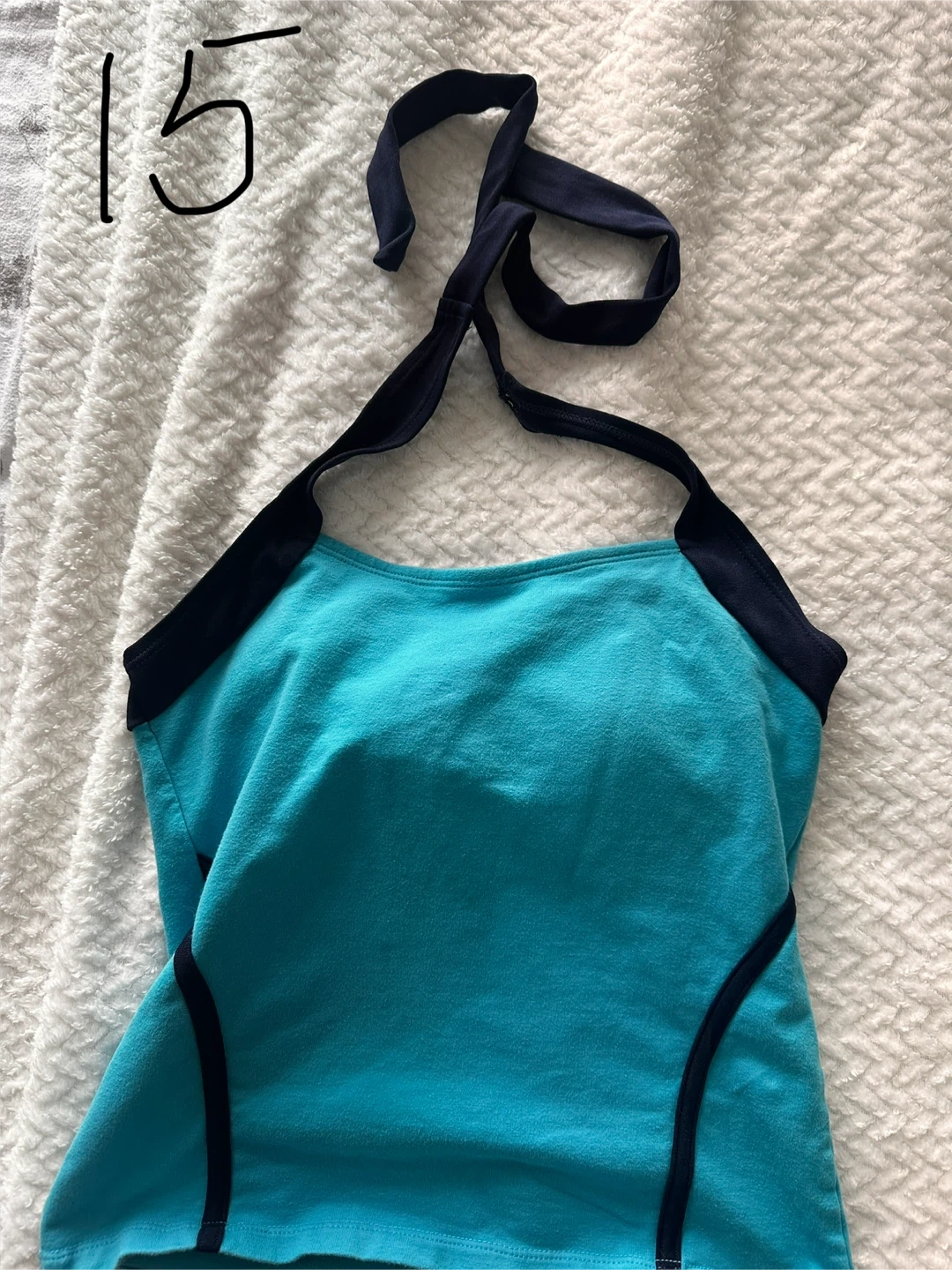 Three tank tops in various colours. The blue top has a halter neck. The red top has thin spaghetti straps. The magenta top features a criss-cross back strap design. These tops are great for casual wear or layering. Only $30 for three items.