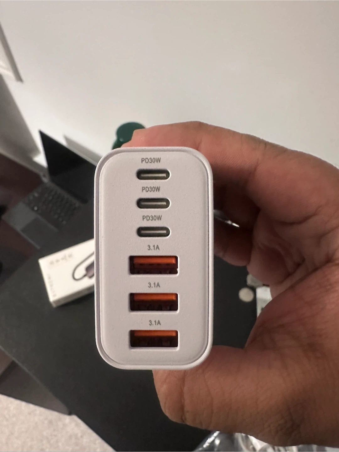 This is a 65W PD 3.0 fast charge USB travel adapter. It's white and has superior speed with optimal safety. It comes with multiple ports for charging different devices.