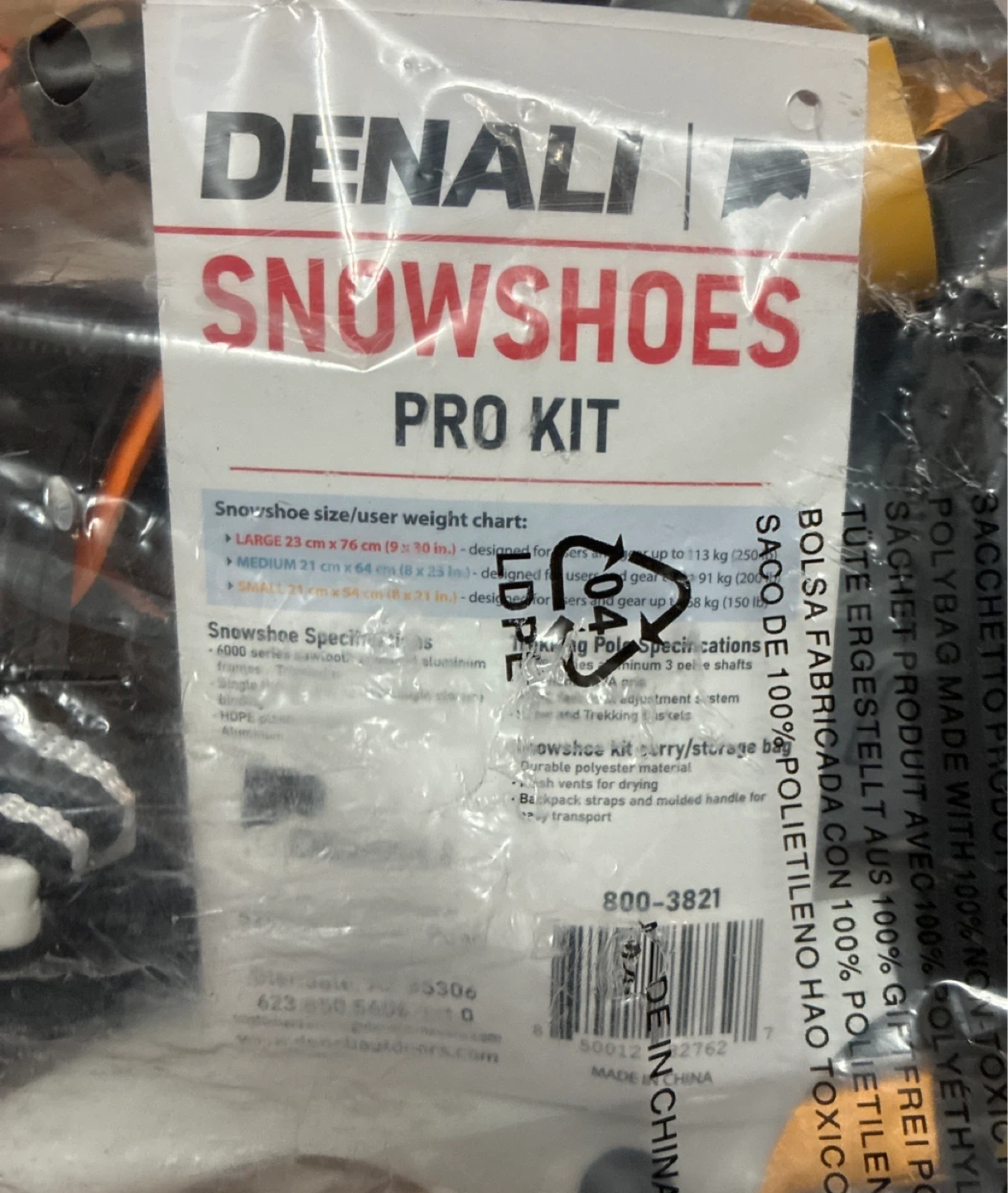 This is a brand new w tags in sealed packaging, Denali Snowshoes Pro Kit. Includes aluminum snowshoes with a binding system. Comes with poles and gear bag. Bag has backpack straps and molded handle for easy transport.