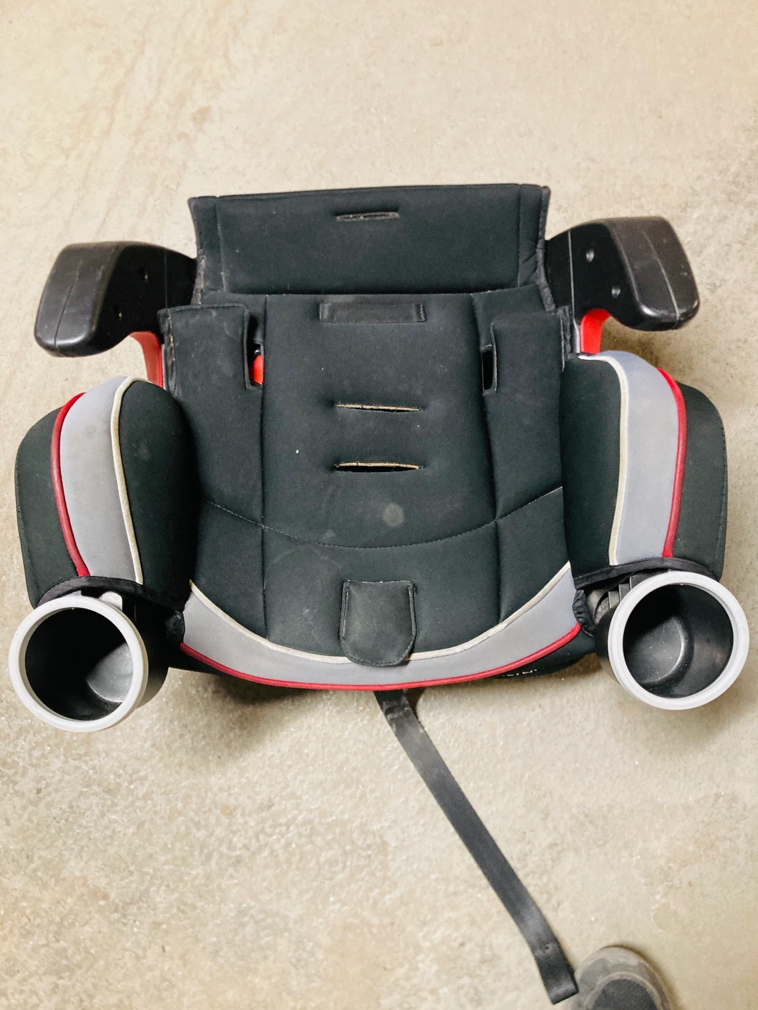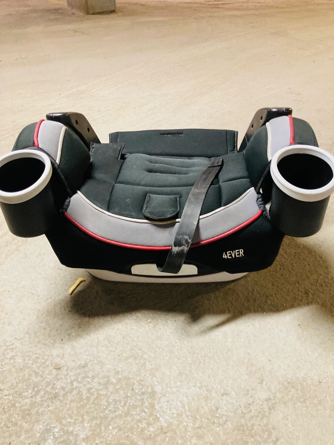 This is an Evenflo 4Ever booster car seat. It's a model with two built-in cup holders. The seat has adjustable armrests for comfort.