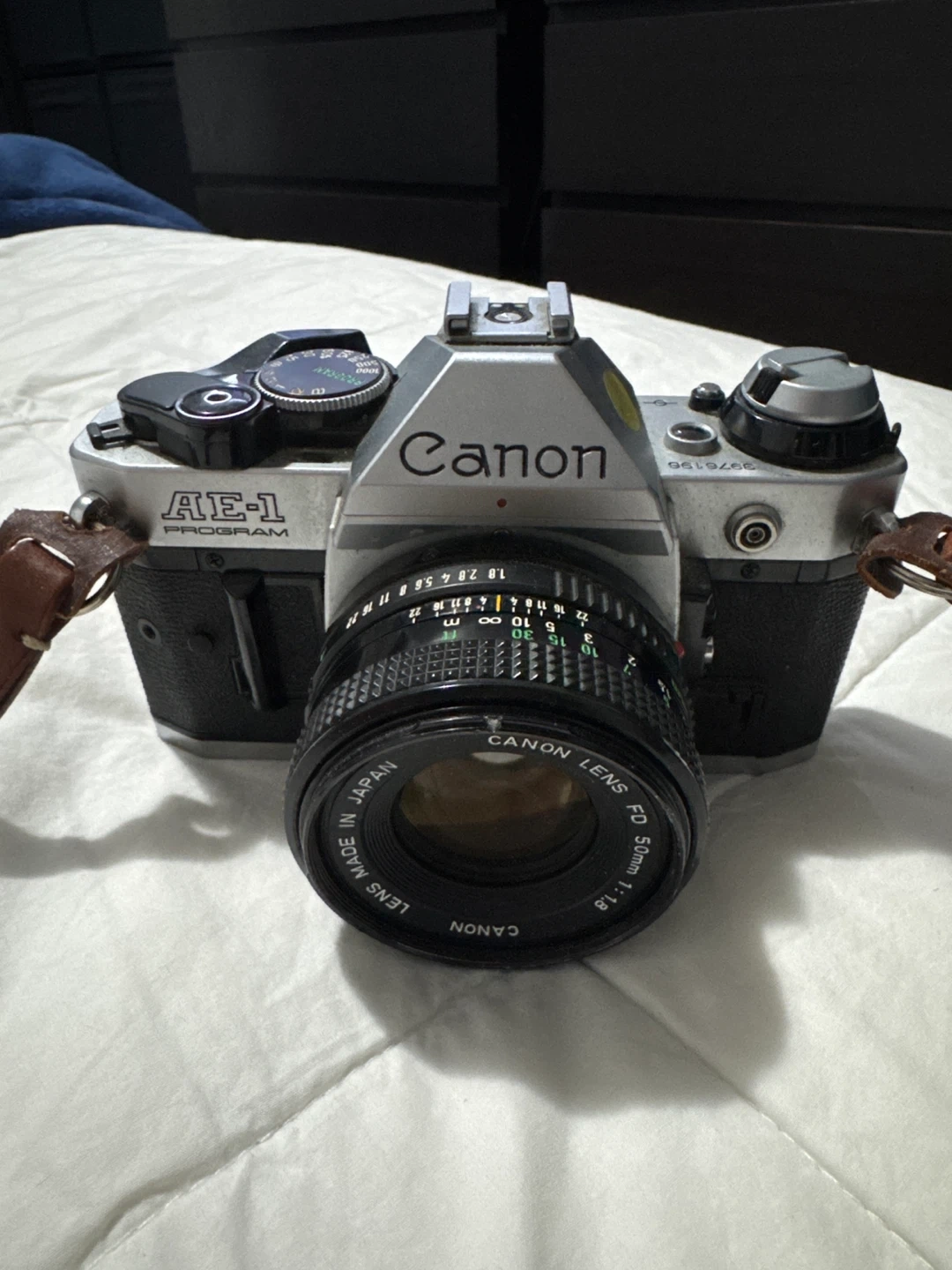 Selling a used Canon AE-1 Program 35mm film camera. It comes with a Canon Lens FD 50mm 1:1.8 lens and strap. There are some signs of wear and tape residue on the bottom, but it works great