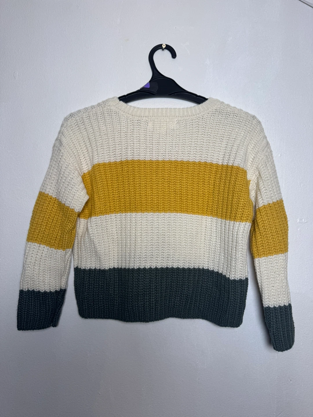 Cream, yellow, and dark green striped knit sweater. Crew neck and long sleeves. Size S.