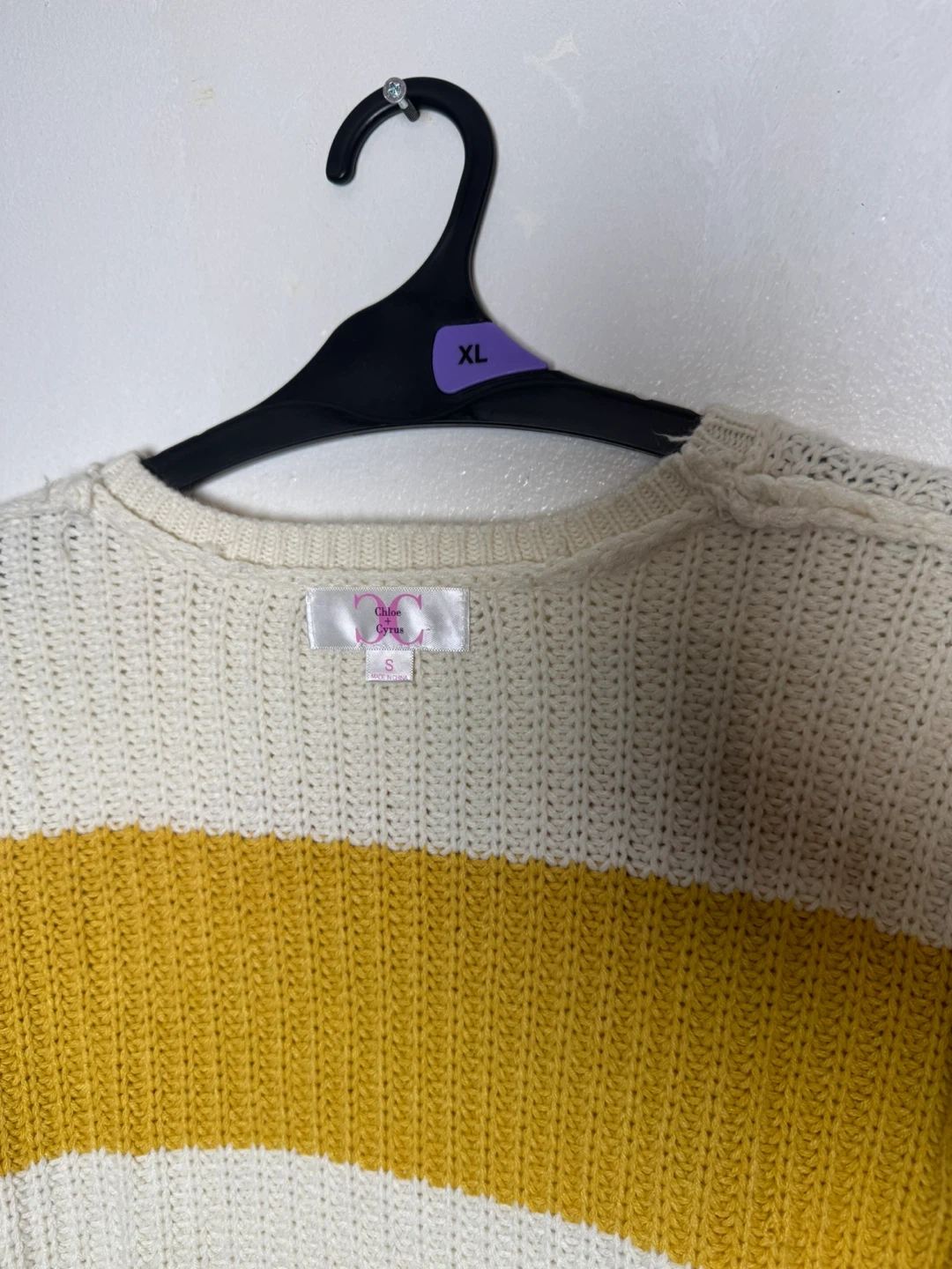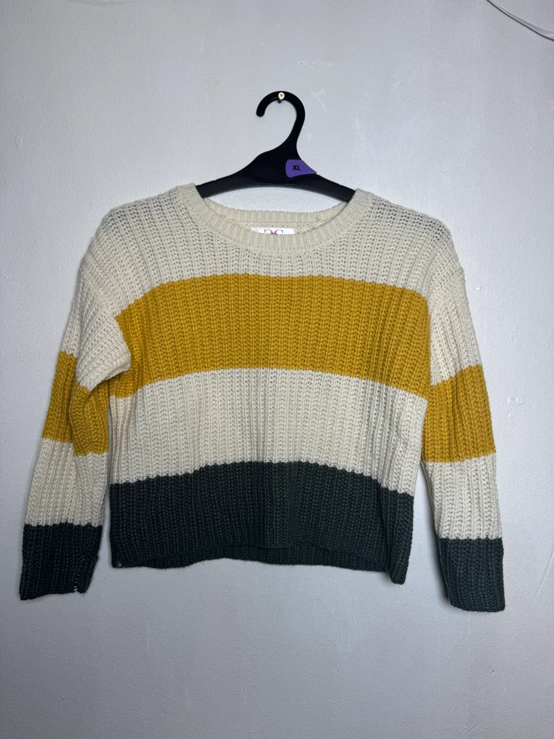 Cream, yellow, and dark green striped knit sweater. Crew neck and long sleeves. Size S.