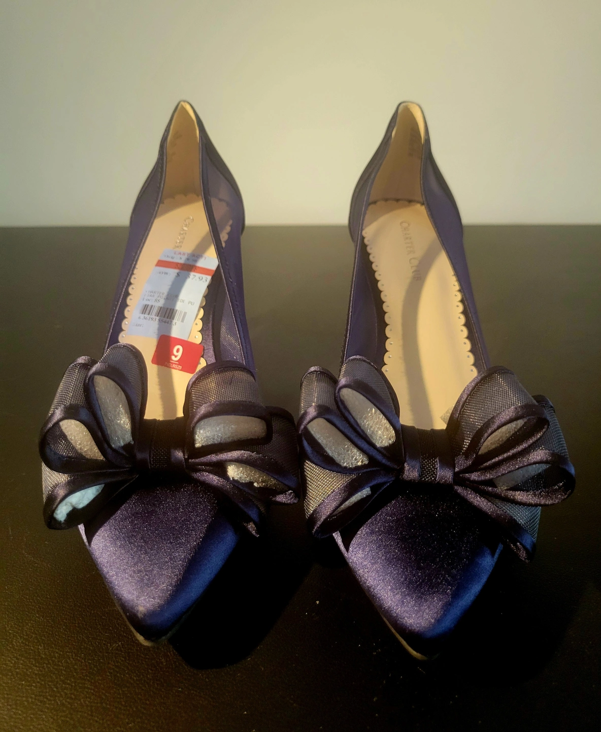 Elevate your look with these beautiful midnight navy satin pumps. These elegant heels feature a delicate mesh side panel and a stunning, oversized layered bow on the pointed toe. The rich satin finish and architectural bow detail make these the perfect choice for that perfect outfit.