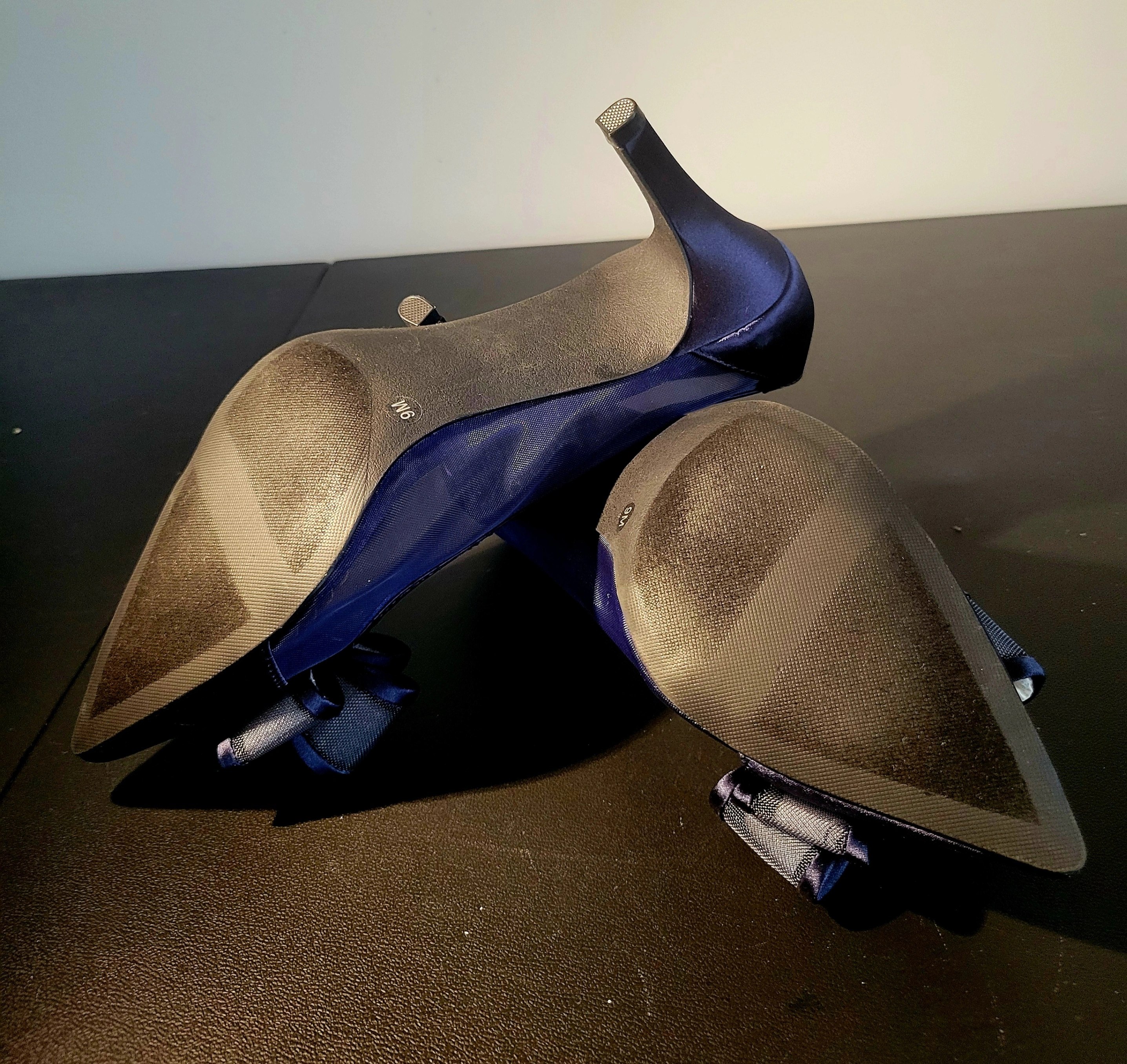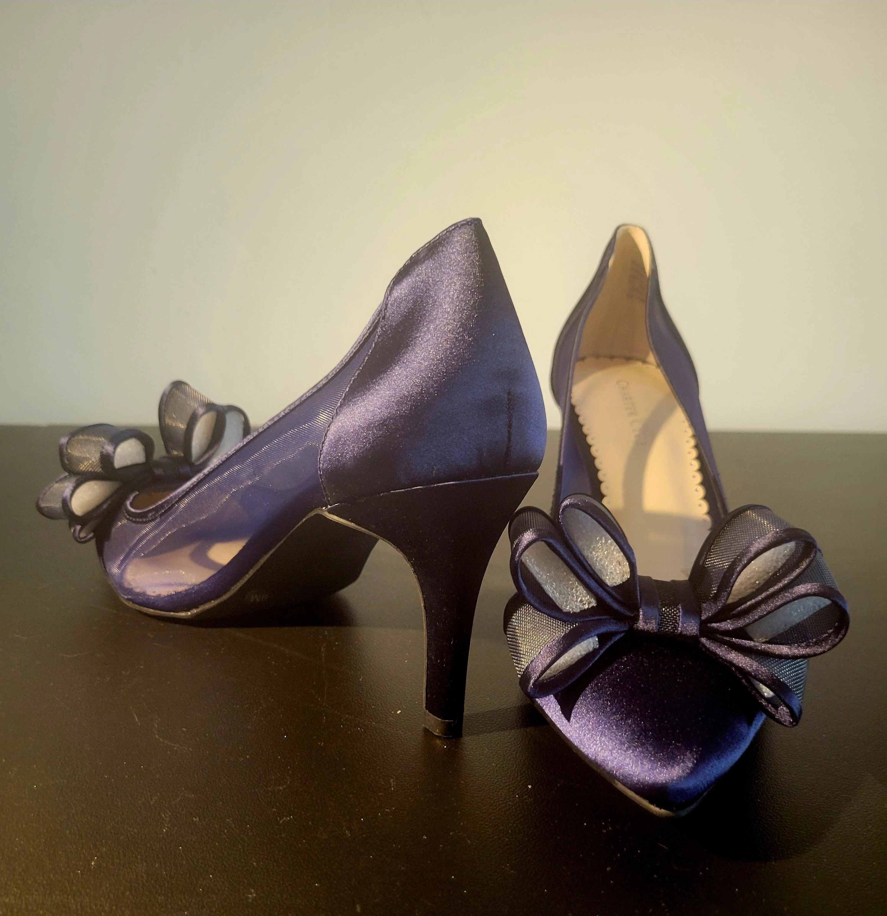 Elevate your look with these beautiful midnight navy satin pumps. These elegant heels feature a delicate mesh side panel and a stunning, oversized layered bow on the pointed toe. The rich satin finish and architectural bow detail make these the perfect choice for that perfect outfit.