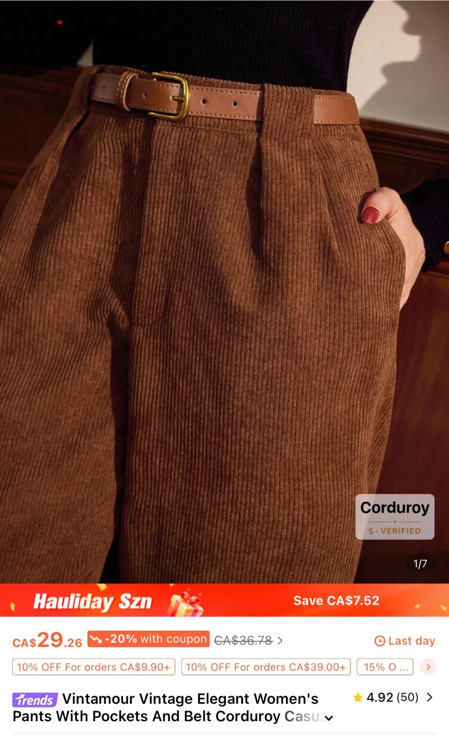Selling a pair of Vintamour vintage elegant women's pants. These pants feature a stylish corduroy texture and a comfortable fit, perfect for adding a touch of vintage charm to your wardrobe. They come with pockets and a belt.