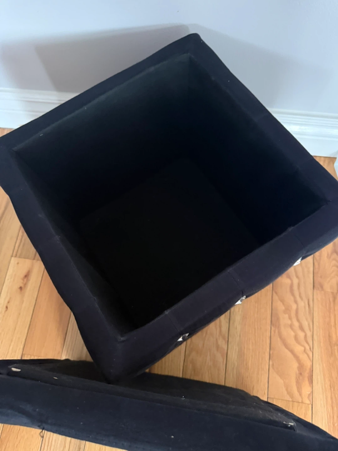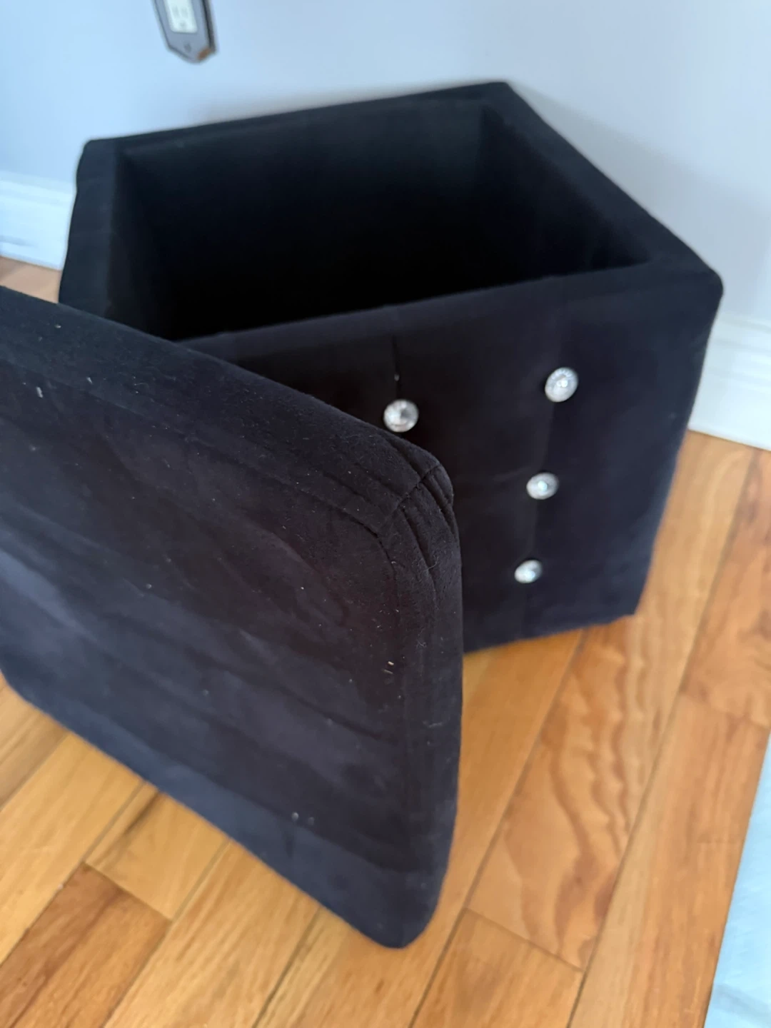 This black storage ottoman is upholstered in a soft velvet material and features decorative crystal buttons. It's perfect for stashing blankets, pillows, or other household items. The lid provides a convenient place to sit or rest your feet.