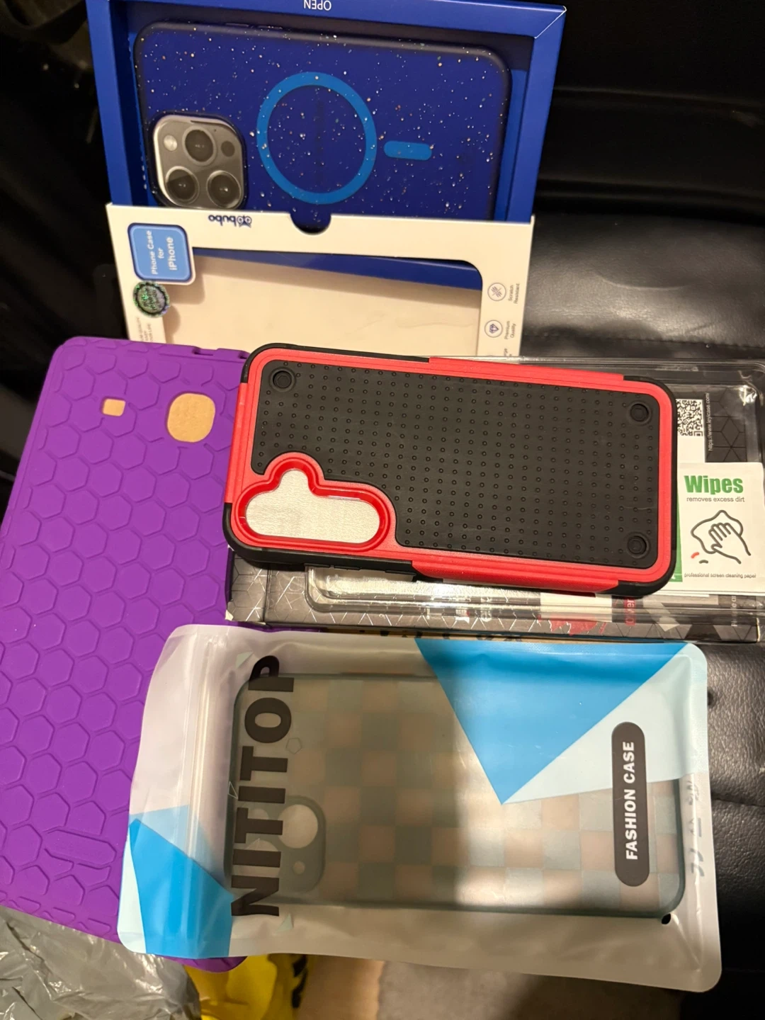 Assorted phone cases including a blue glitter case, a red and black rugged case, a purple tablet case, and a clear fashion case. Includes cases for iPhone and other models.