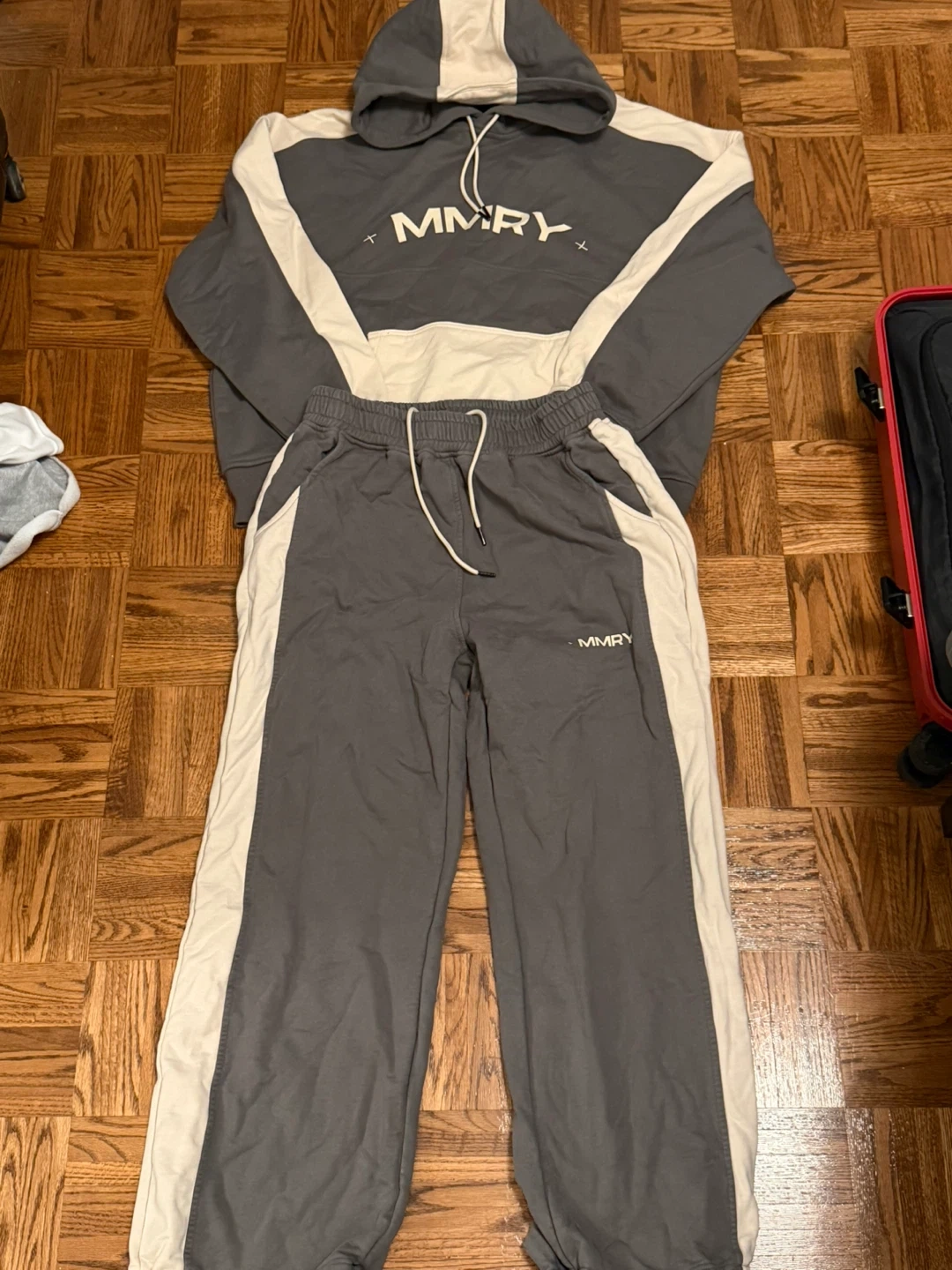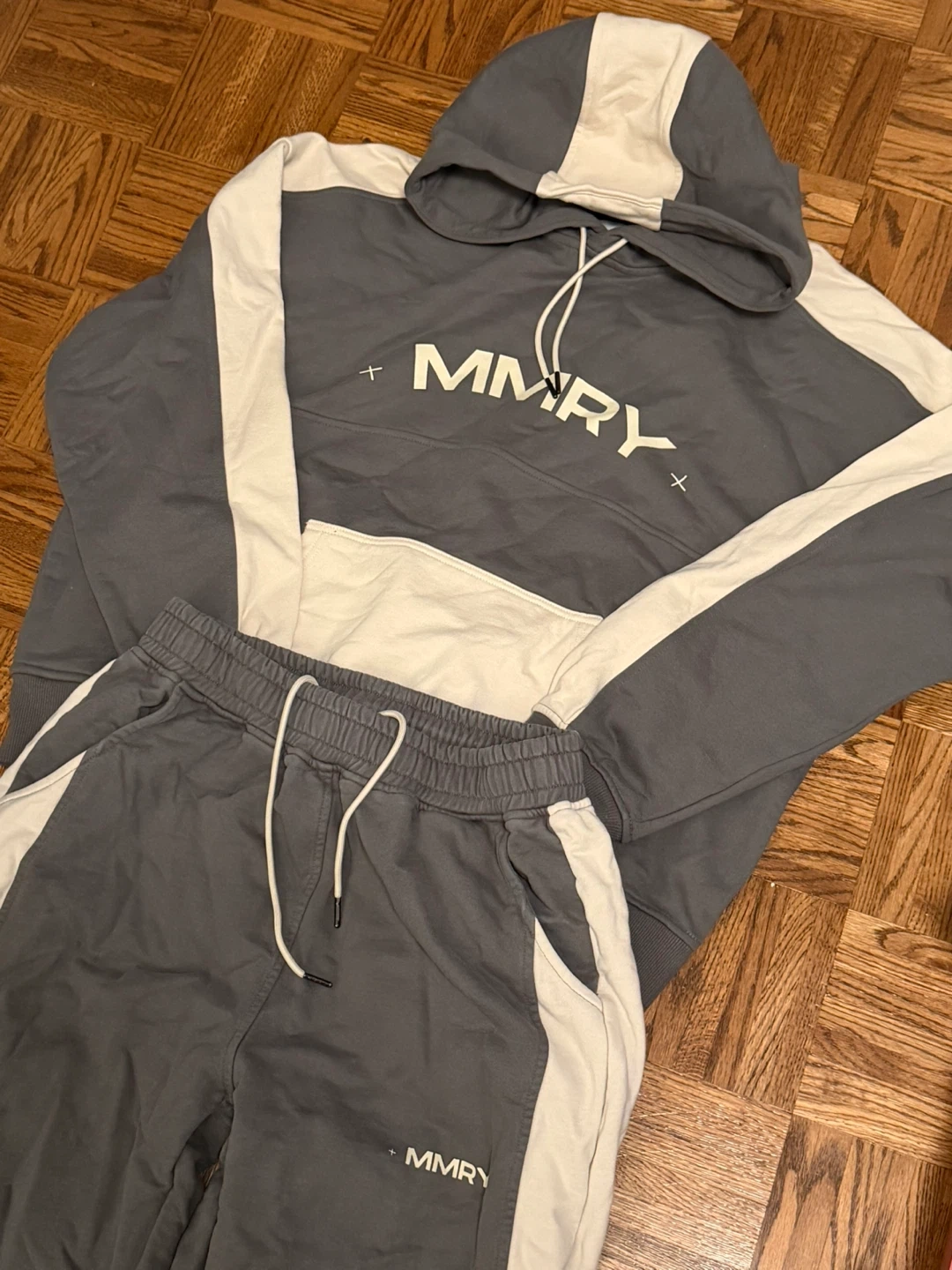 This MMRY tracksuit set includes a grey hoodie and matching pants. Both pieces feature cream-coloured accents and the MMRY logo. It's a comfortable set for everyday wear.