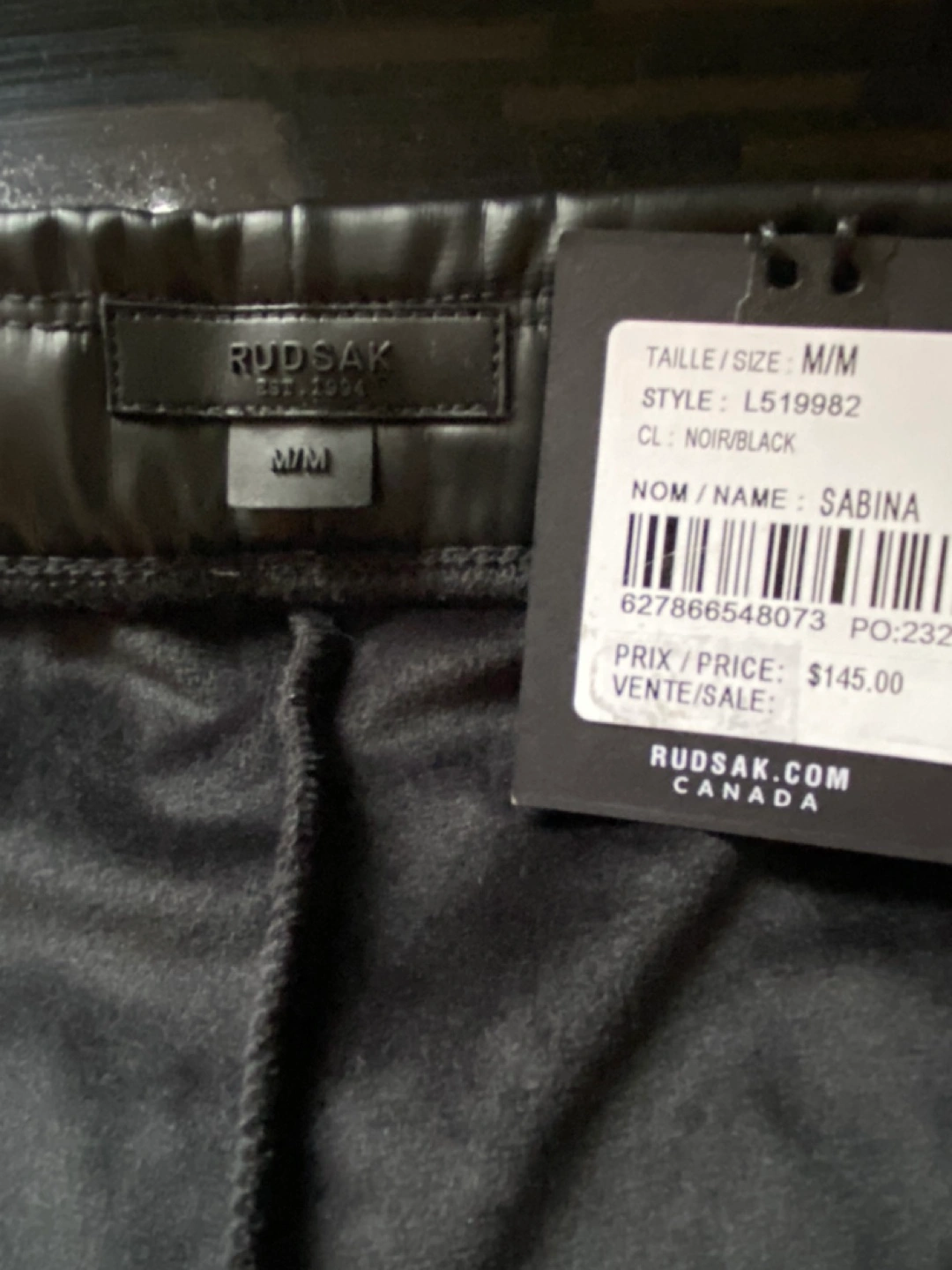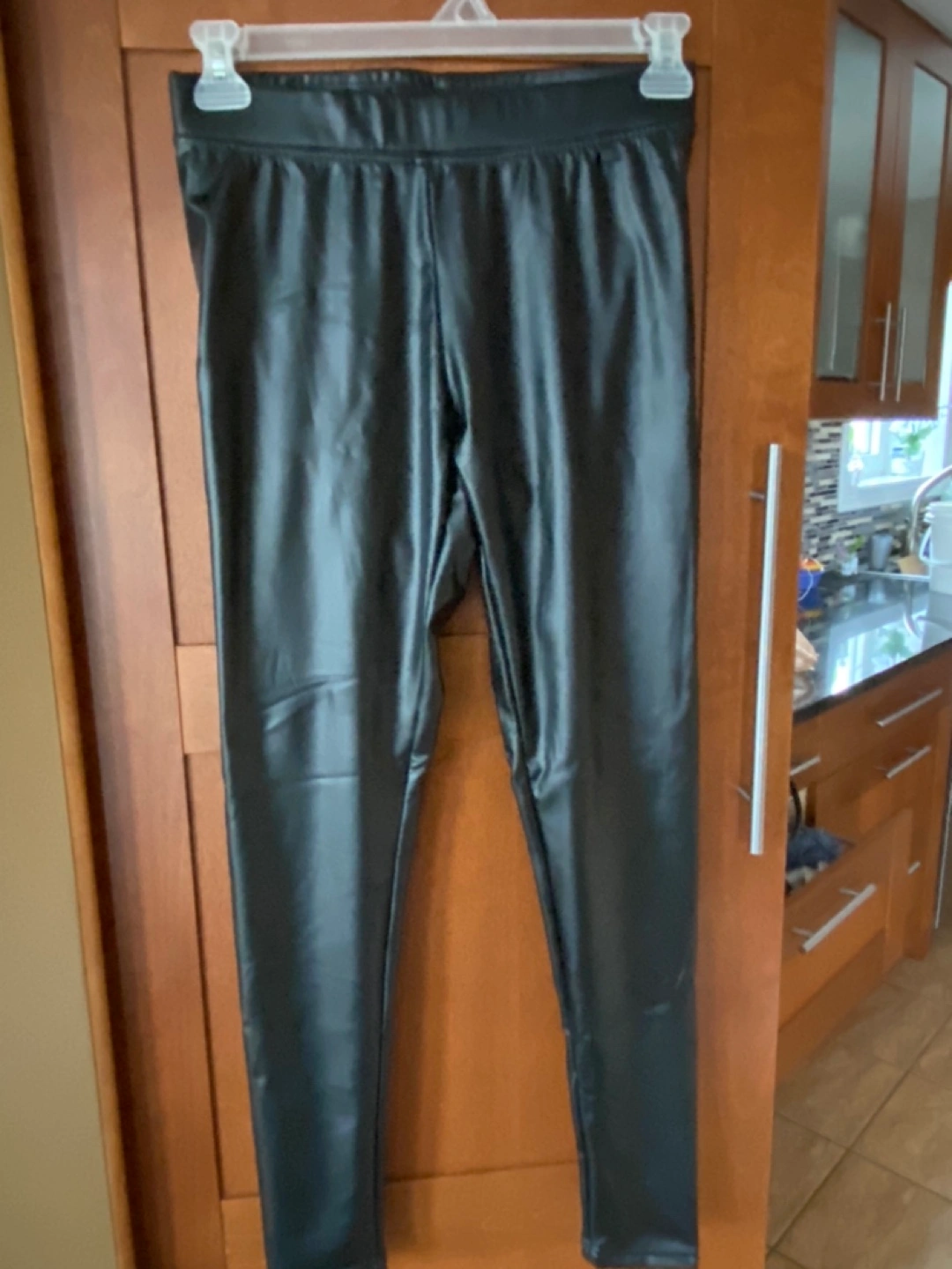 Black leather leggings with an elastic waistband. Size M/M. Brand new with tags. Leggings have a velvet lining