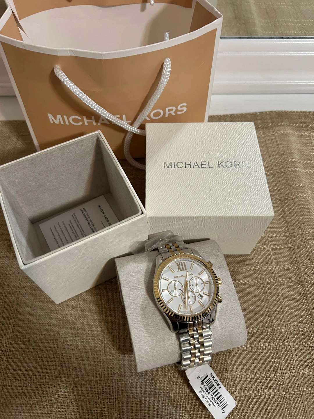 Brand new Michael Kors men's watch. Two-tone stainless steel band. White face with chronograph function. Comes with box and shopping bag.