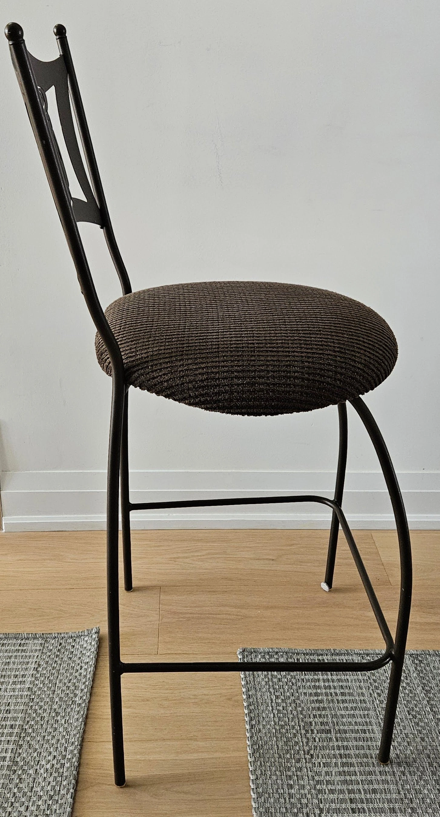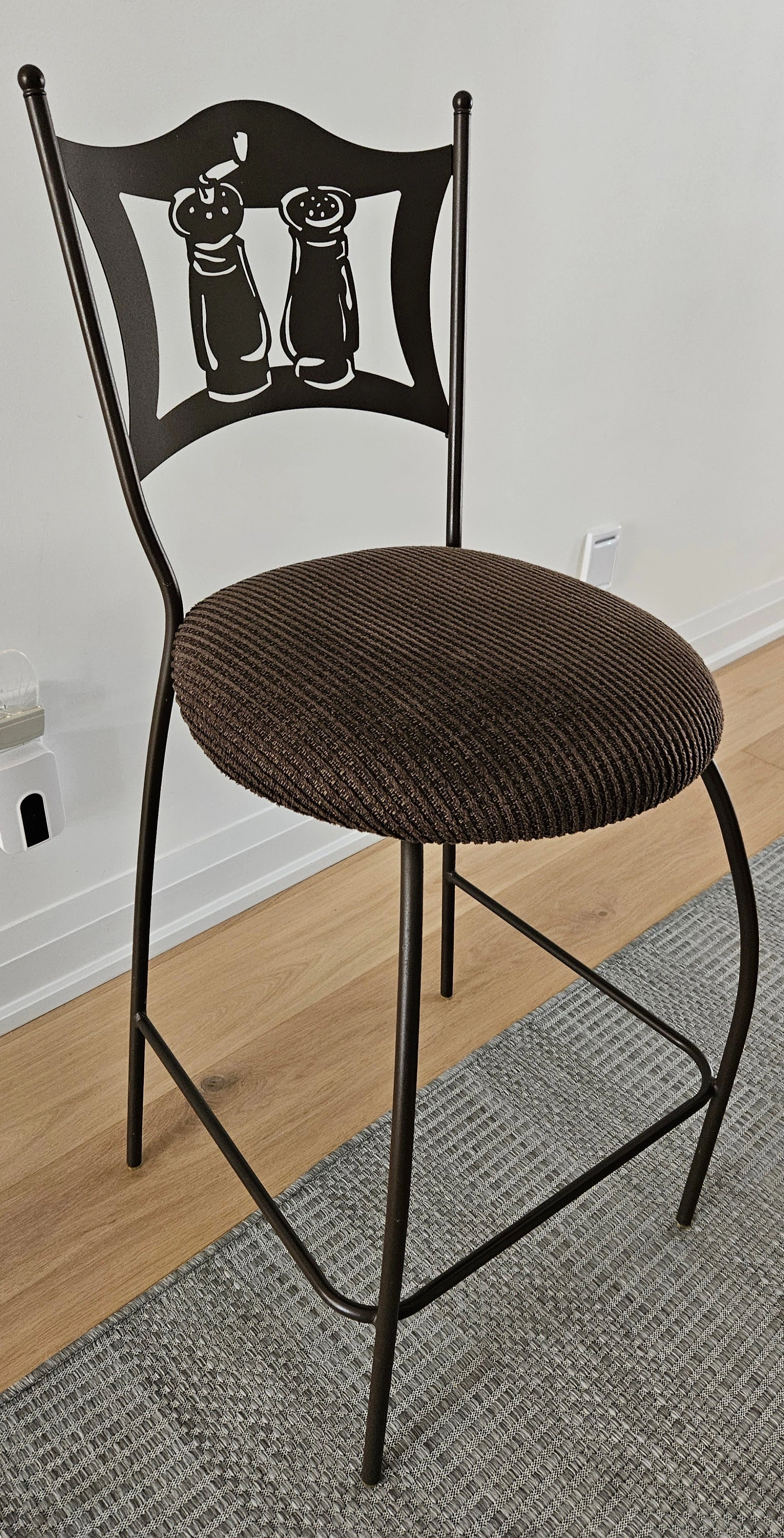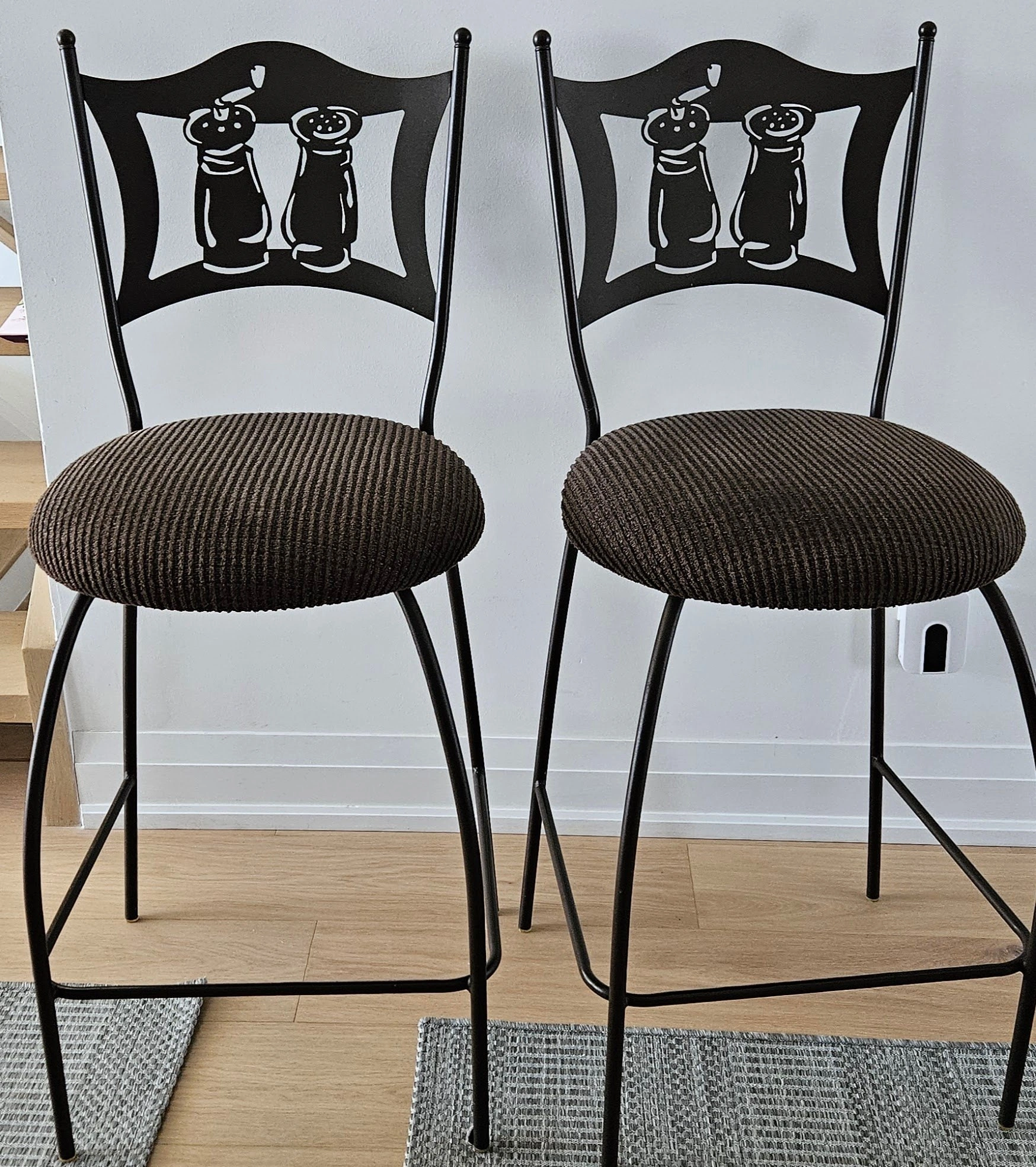 Bistro metal kitchen chairs with a unique salt and pepper shaker design on the backrest. The seats are upholstered in a brown fabric. They're in good condition.