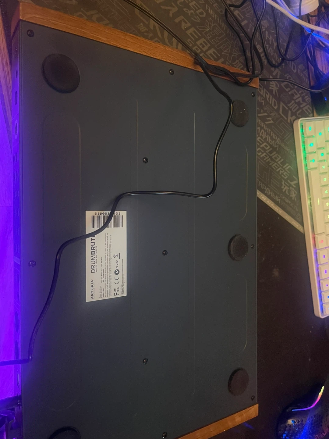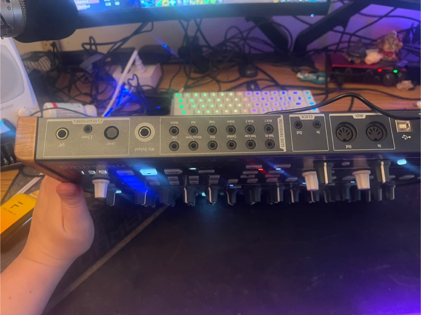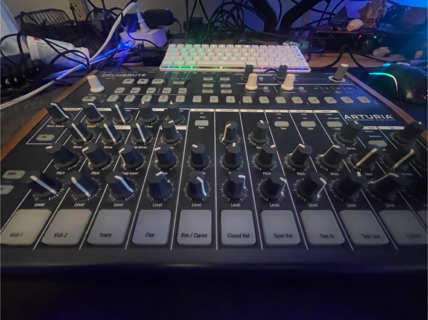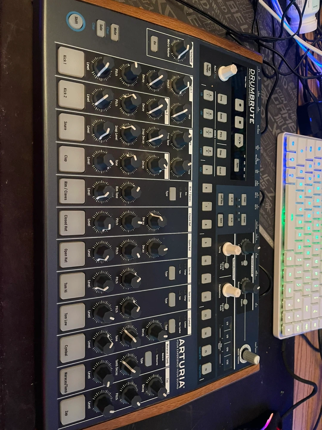It's an Arturia DrumBrute analog drum synthesizer. It features multiple sound engines and pattern effects. This synth is great for electronic music production!