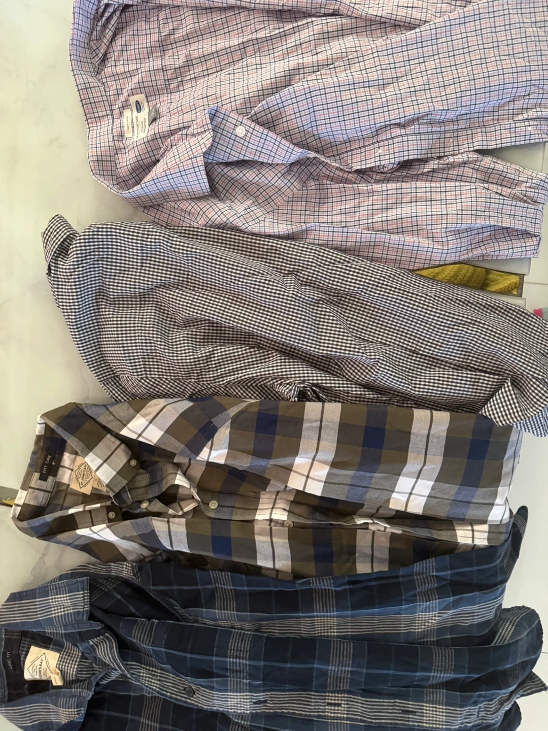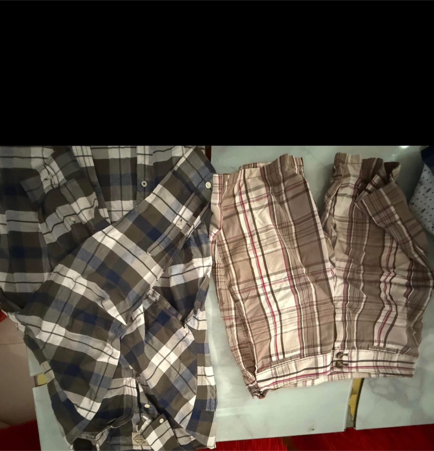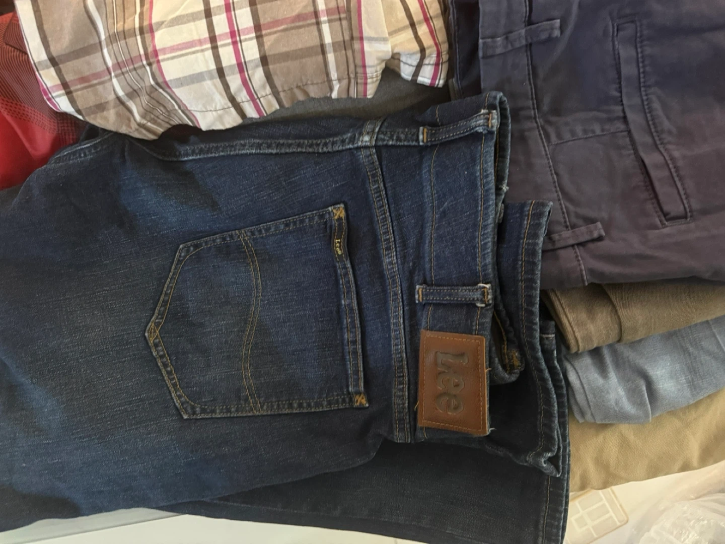 Bundle of men's clothing including shirts, shorts, and a jacket. Features brands like Under Armour and Dockers. Various colors and plaid patterns. Most items appear to be size medium.