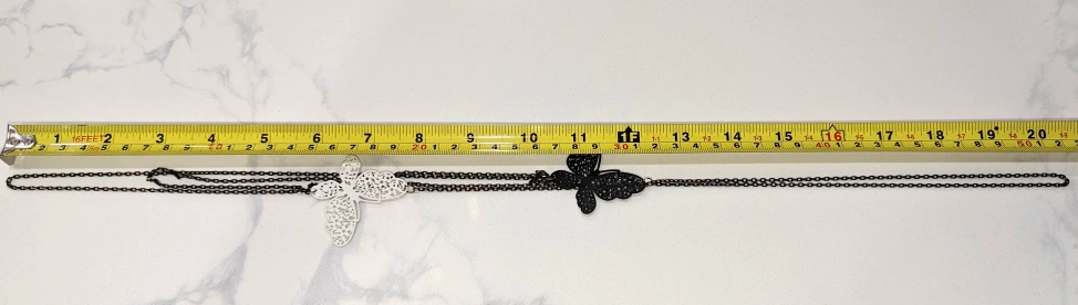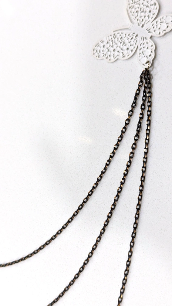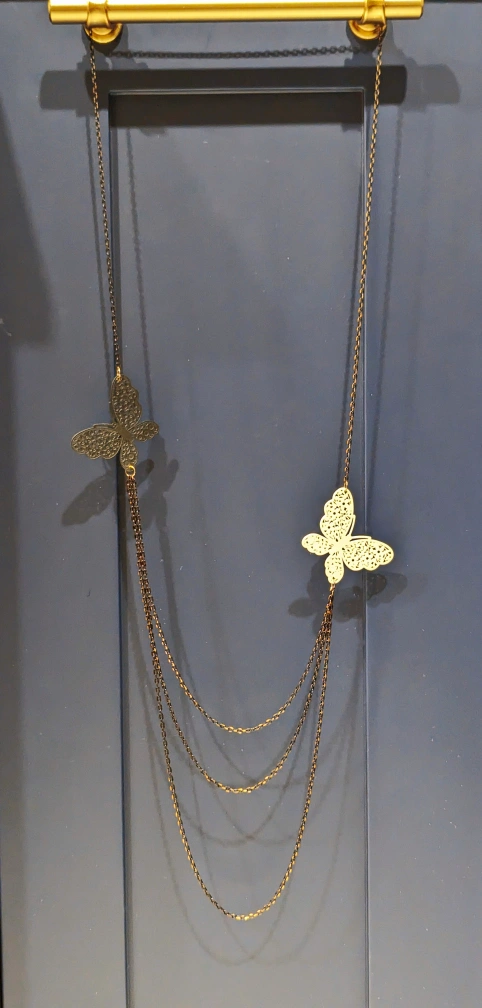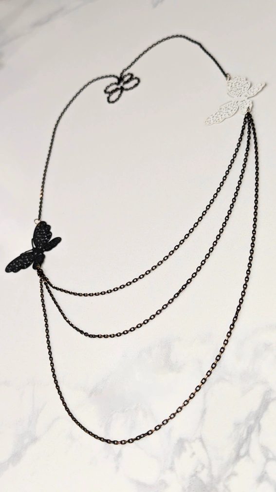 Two antique looking thin metal butterflies linked up by narrow black and gold chains.