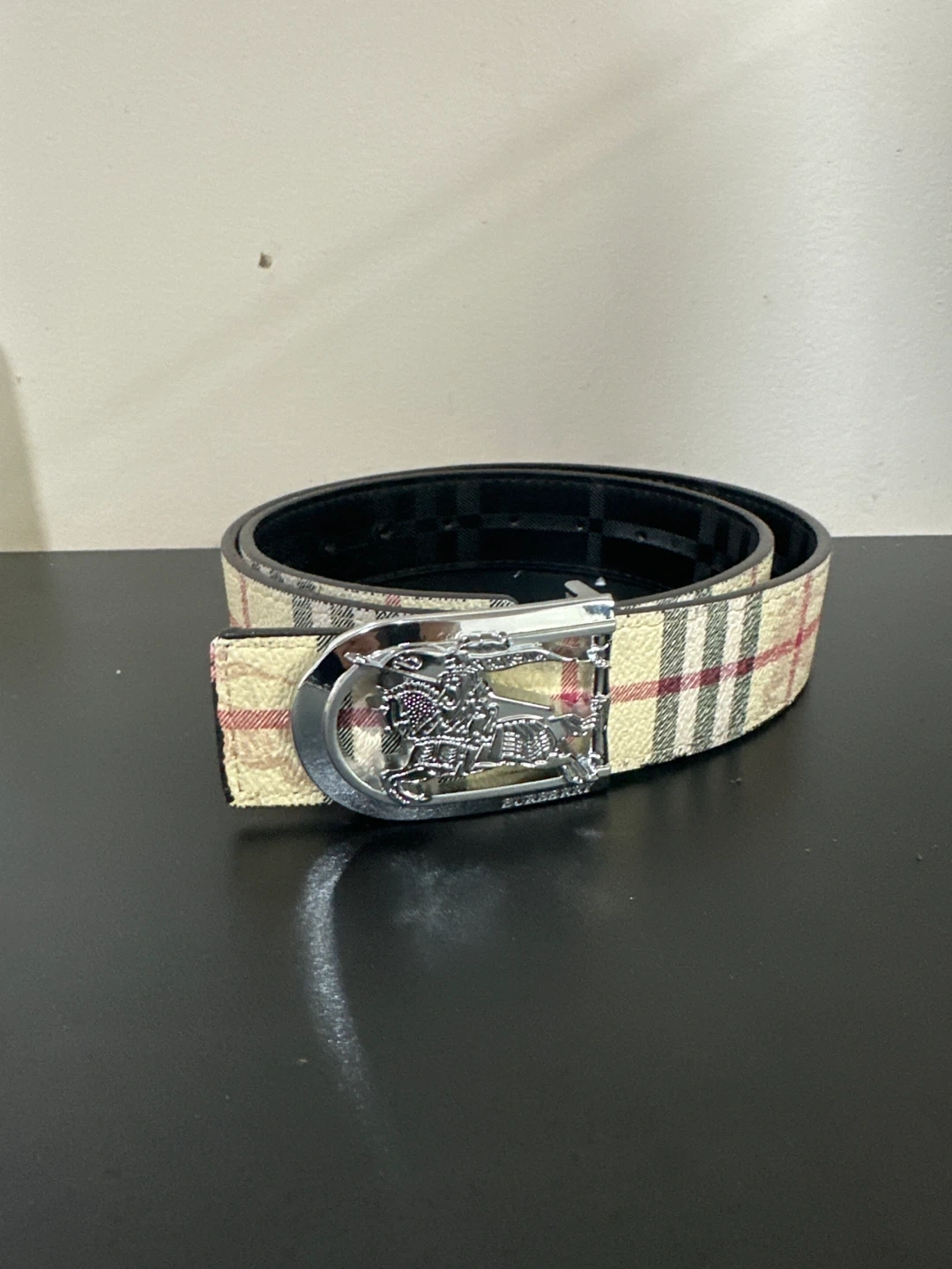 Burberry reversible belt featuring the iconic Nova Check pattern on one side and black checkered pattern on the other. It's finished with a polished silver-tone buckle showcasing the Equestrian Knight emblem. A stylish accessory for any wardrobe!