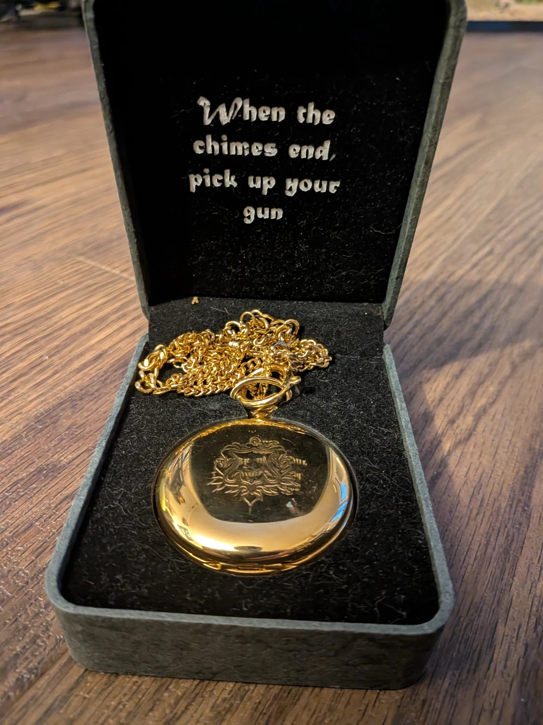 This is a gold-toned pocket watch presented in a decorative box. The lid of the watch opens to reveal a black and white portrait. The inside of the box lid has text that reads "When the chimes end, pick up your gun".