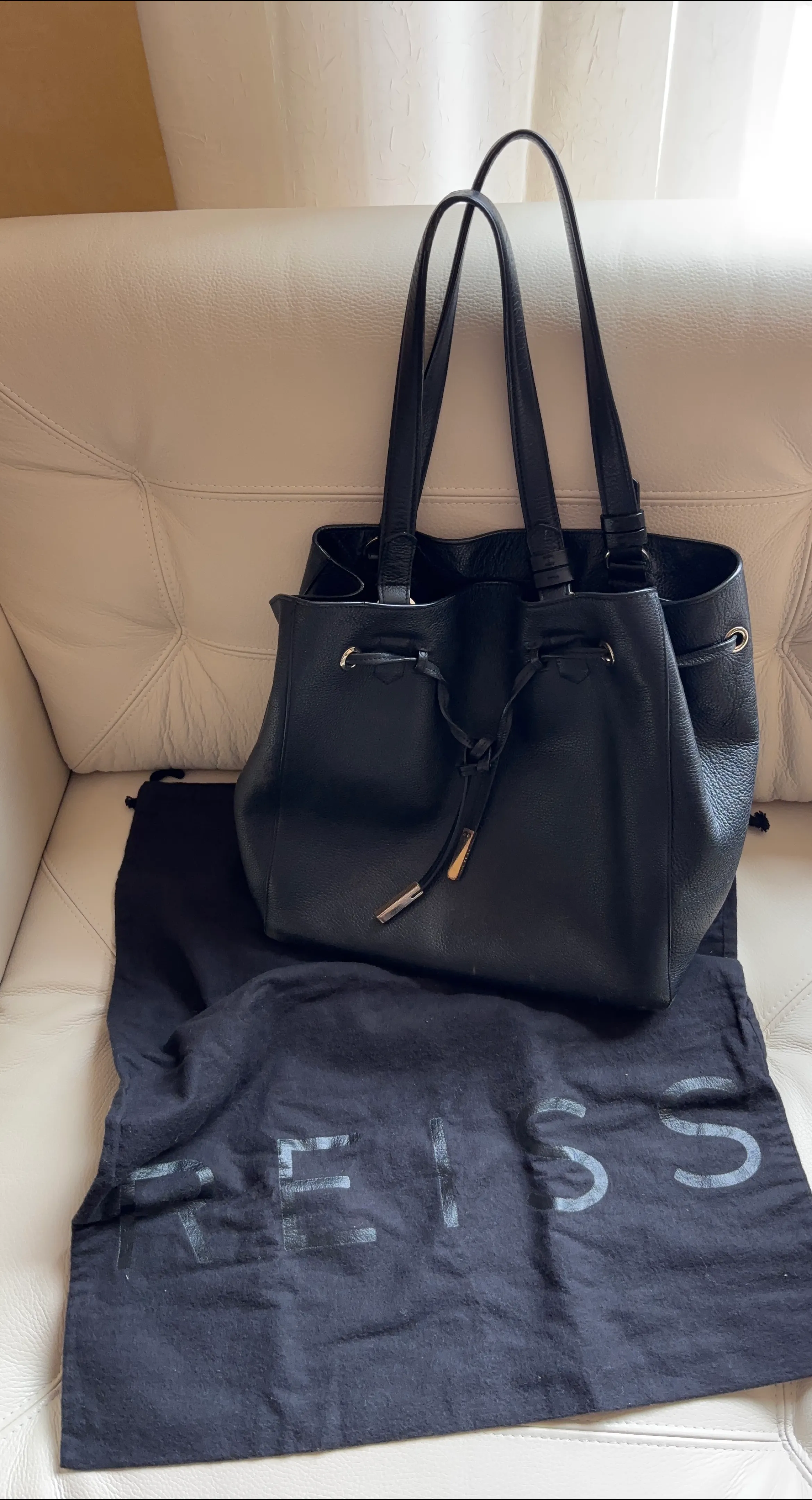 A classic black tote purse by Reiss of London. It includes the original dust bag. Perfect for everyday use. The bottom corners show minimal wear and the straps have some wear too but otherwise in great condition. From a pet and smoke free home. Pickup only in the St Lawrence market area of downtown Toronto. Cash only.
