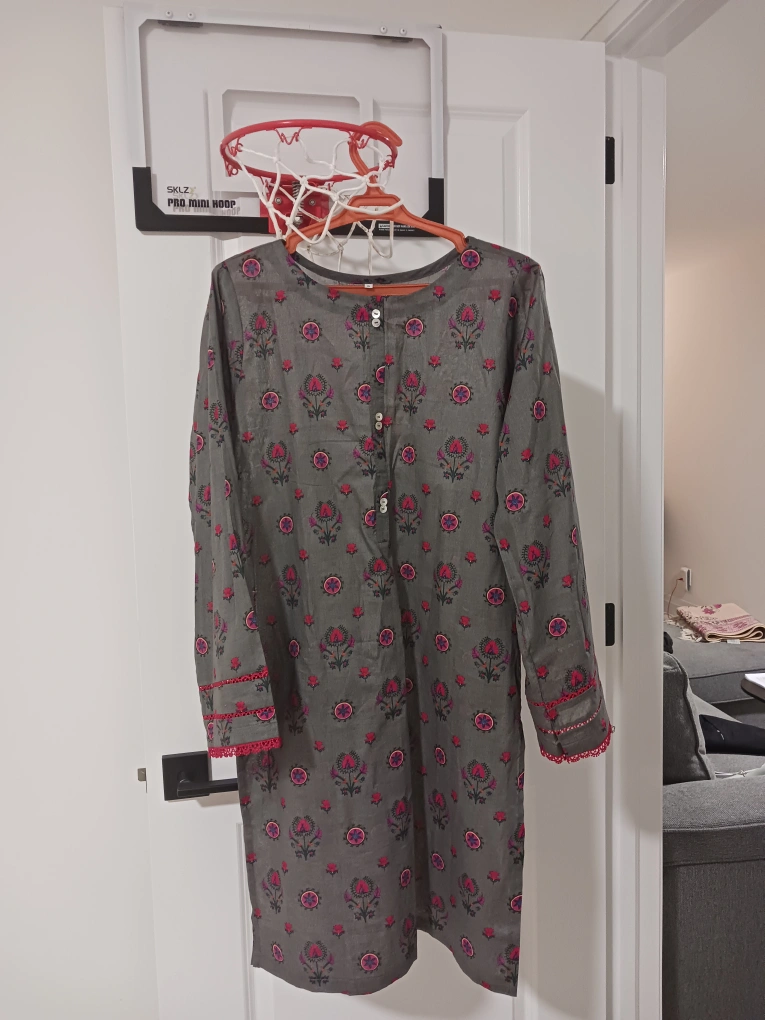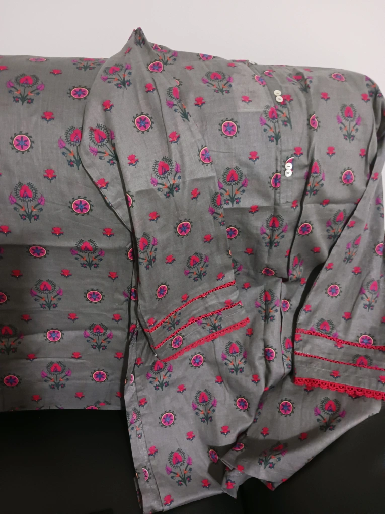 Here's a lovely grey tunic with a pretty floral print! It features long sleeves and a button-up front. Perfect for adding a touch of style to your wardrobe