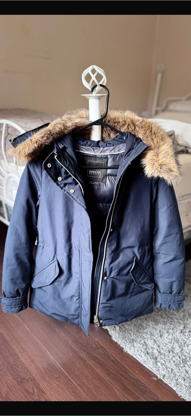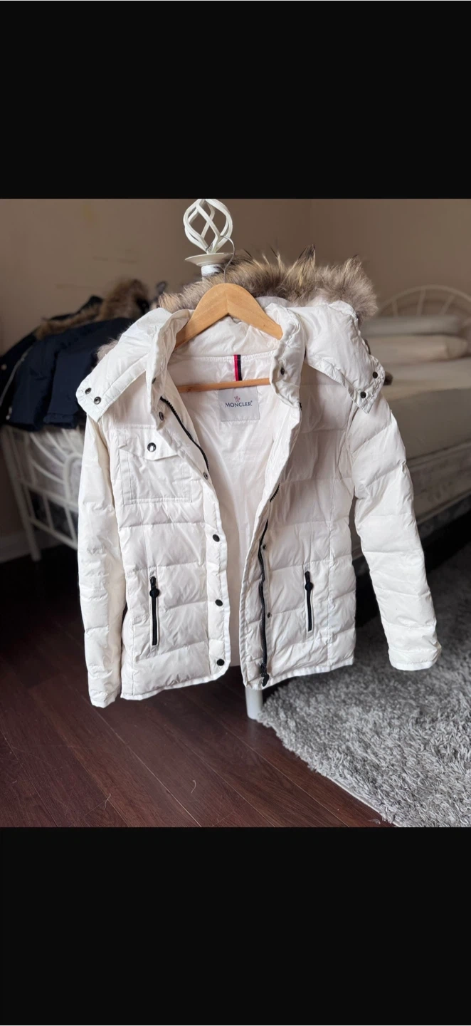 Two warm winter jackets, one navy blue by Geox and one cream by Moncler. Both feature faux fur-lined hoods and zippers. These are great for keeping cozy during colder months!