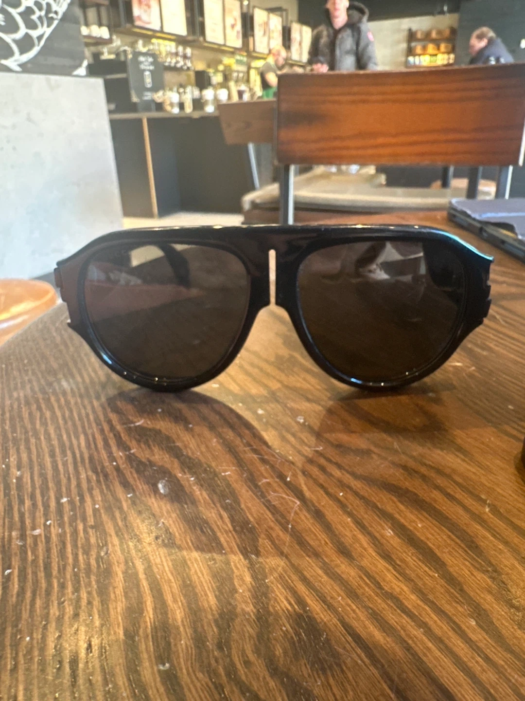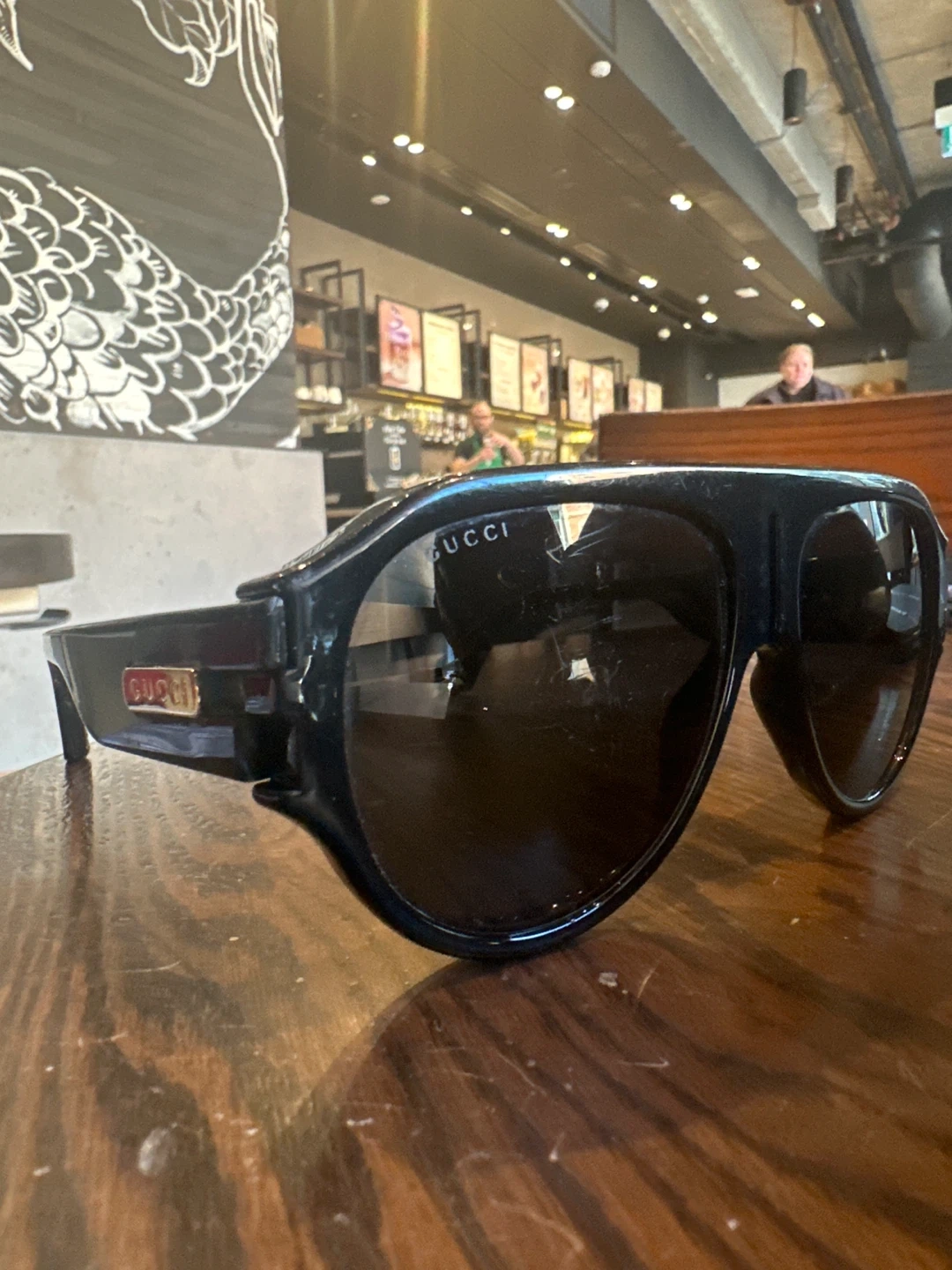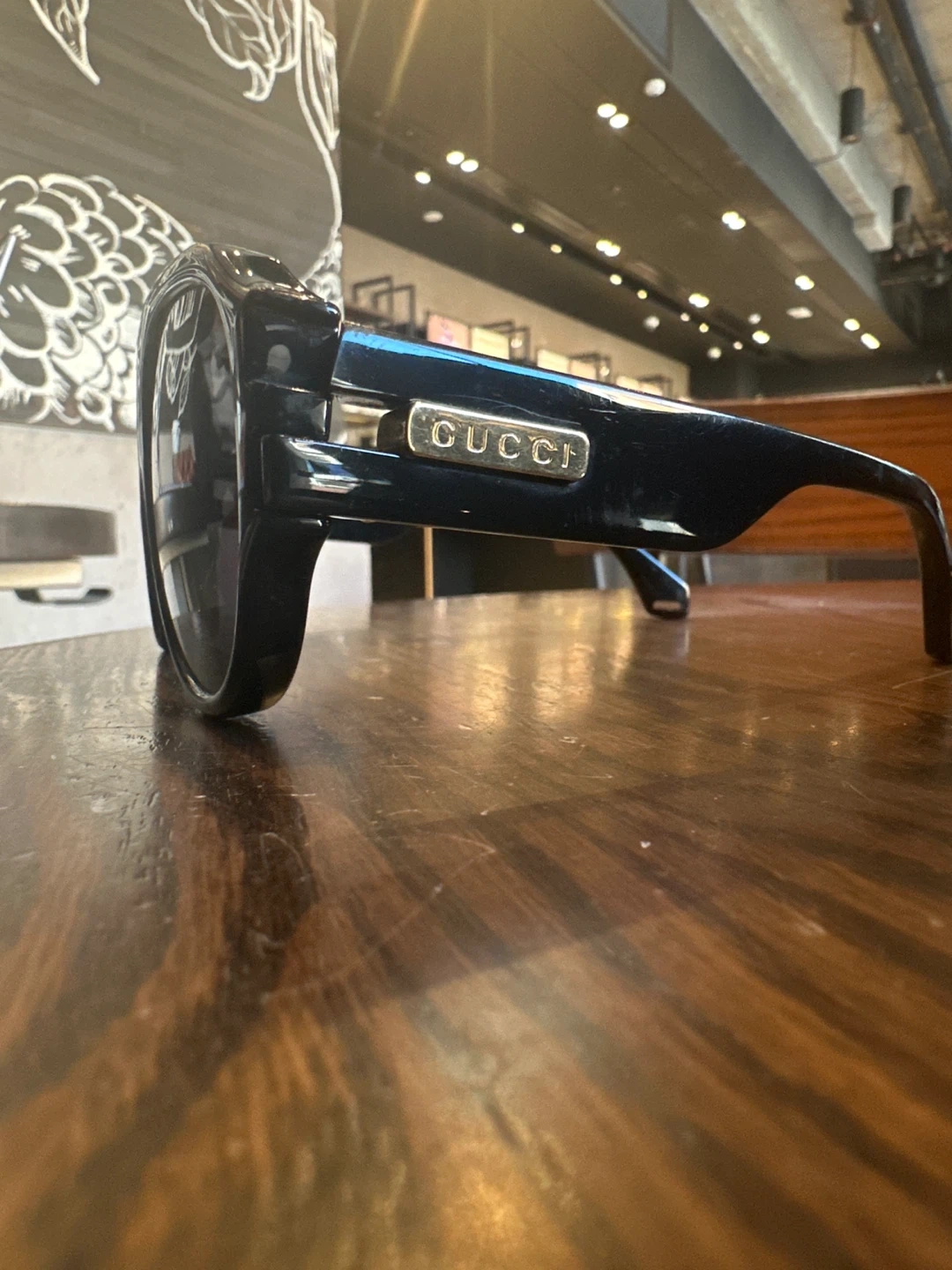 Stylish black GUCCI sunglasses with gold-tone accents. These shades offer a bold look. Perfect for sunny days and making a statement!