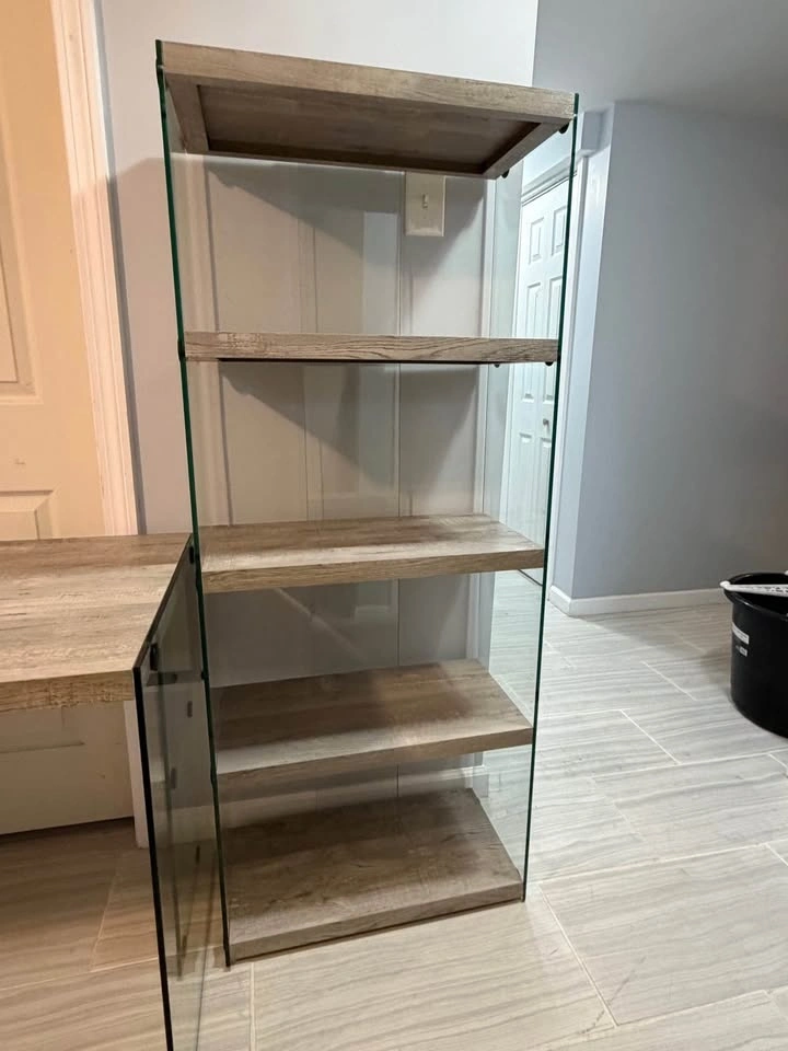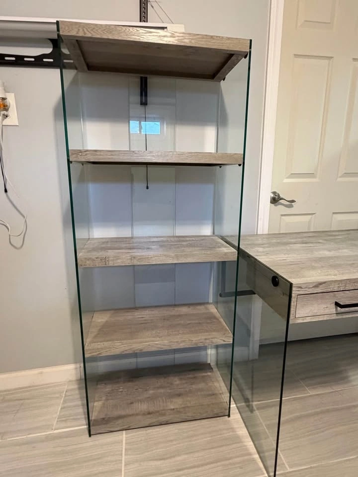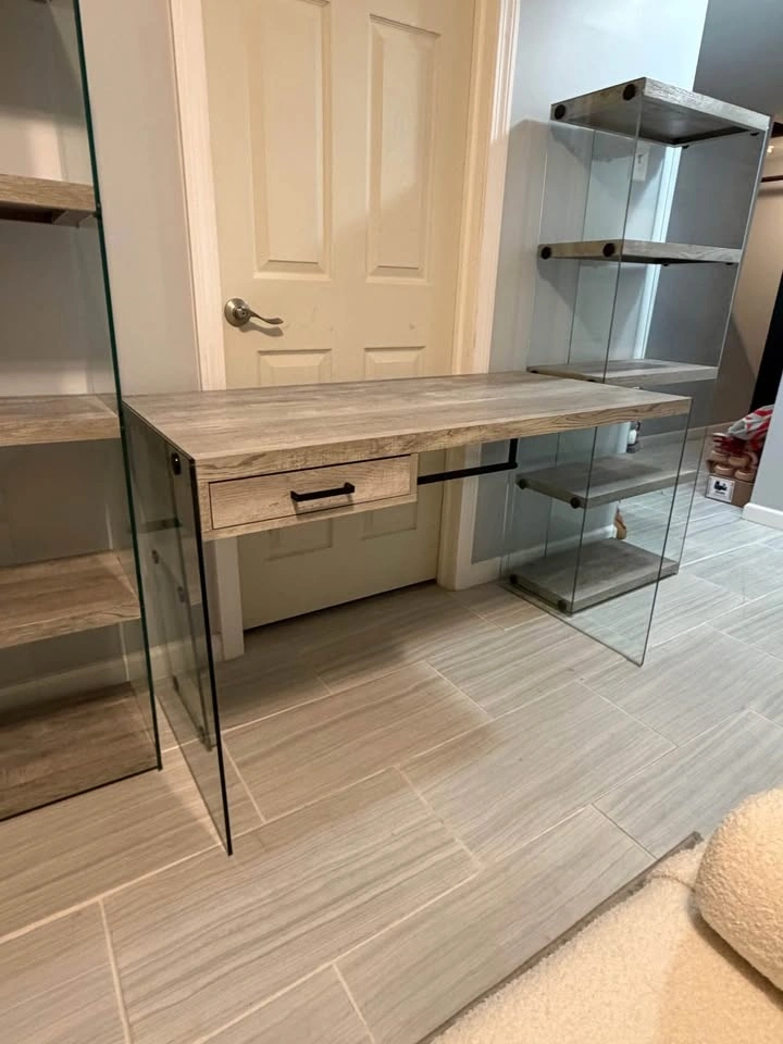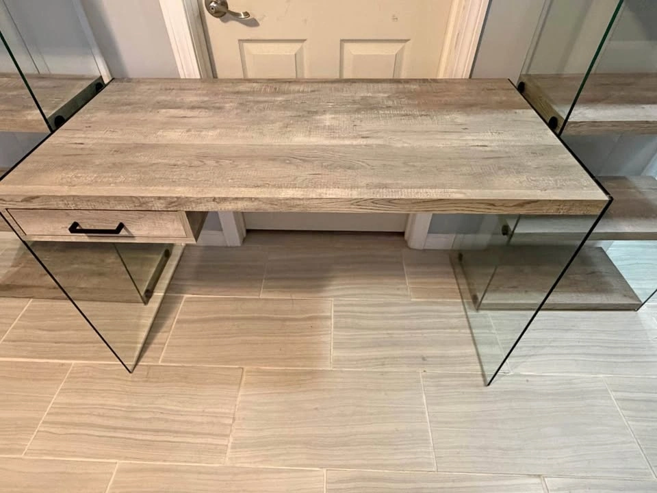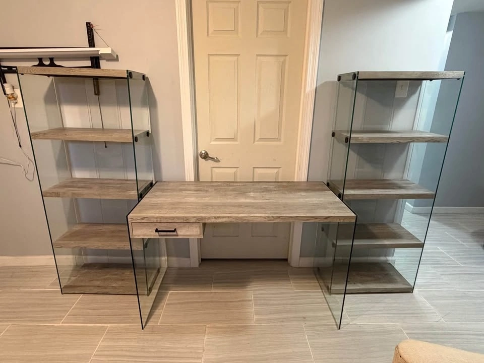 Monarch Specialties computer desk and matching bookshelves in a grey reclaimed wood-look finish with tempered glass panels. Includes desk and 2 bookshelves. Asking $650 for all.