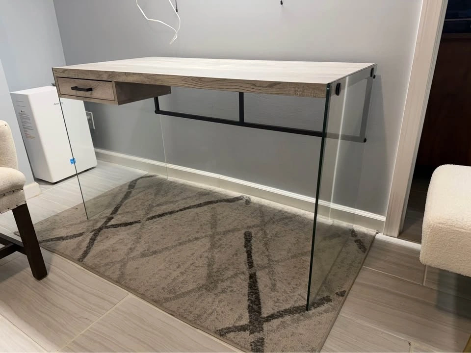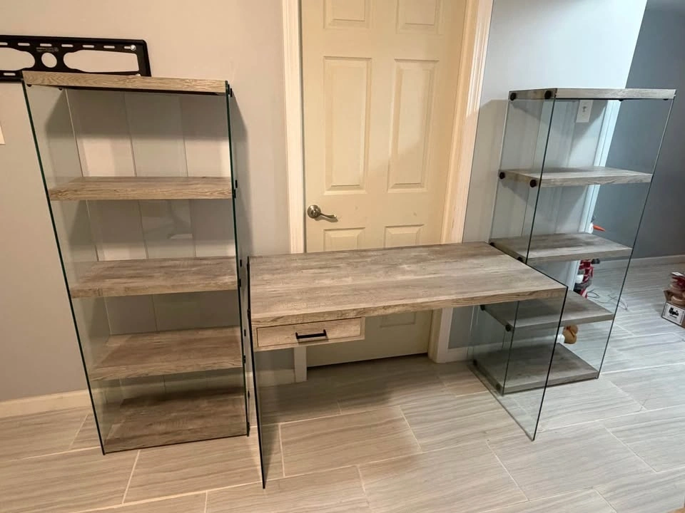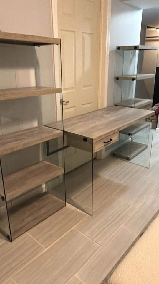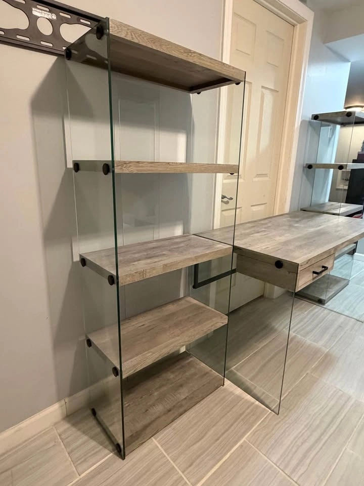 Monarch Specialties computer desk and matching bookshelves in a grey reclaimed wood-look finish with tempered glass panels. Includes desk and 2 bookshelves. Asking $650 for all.