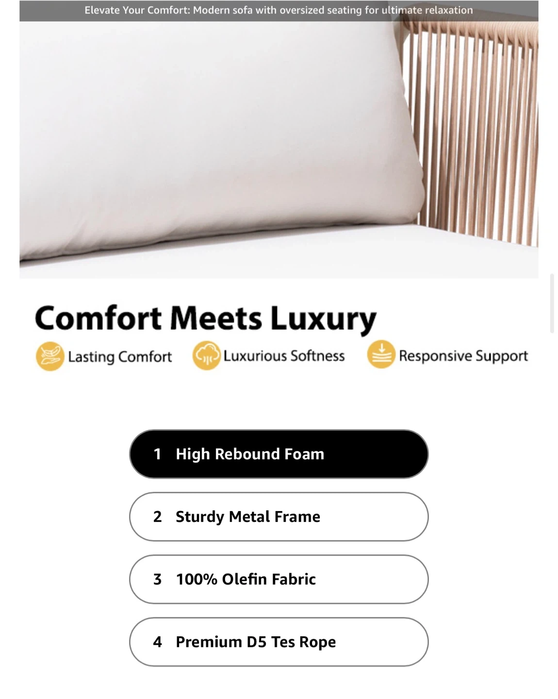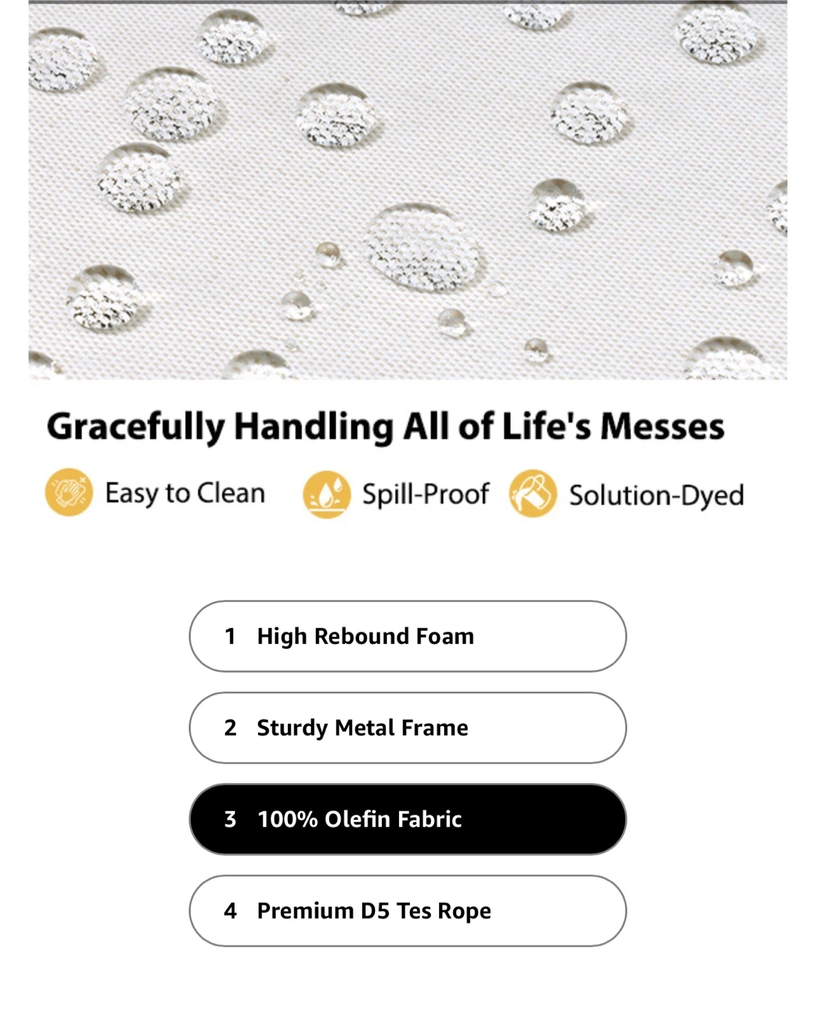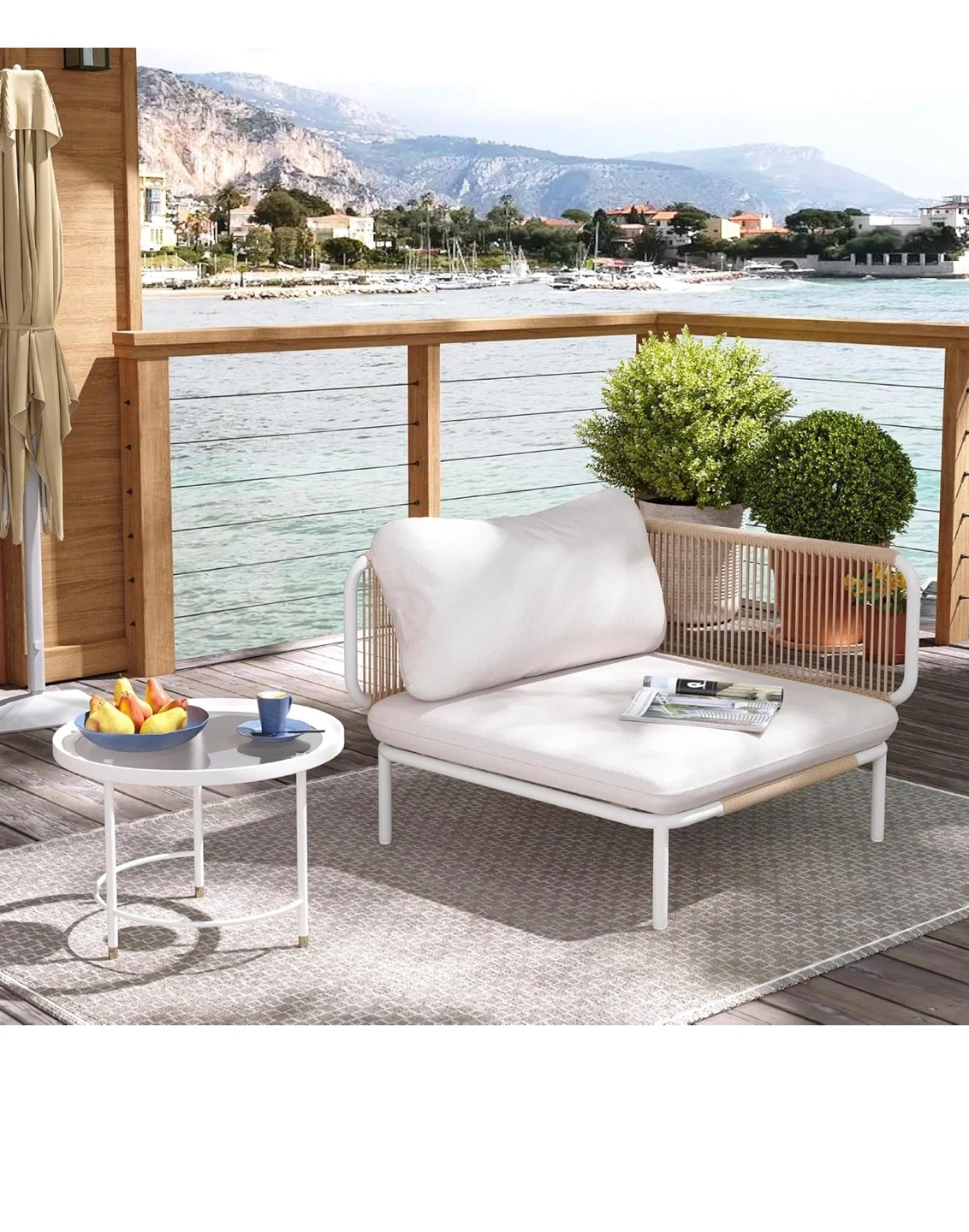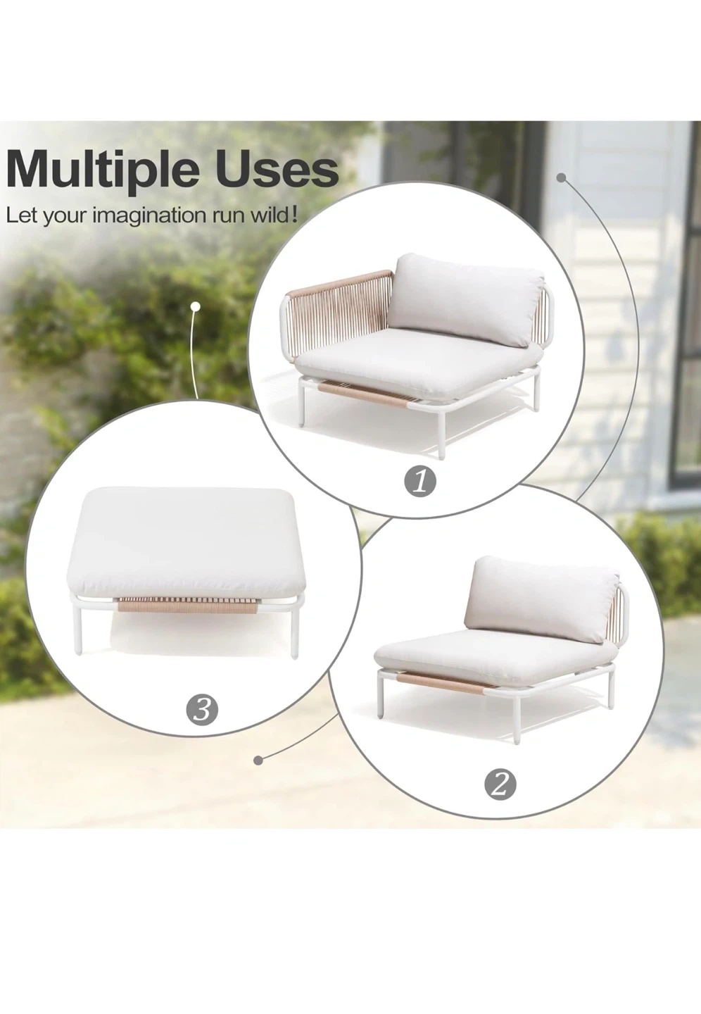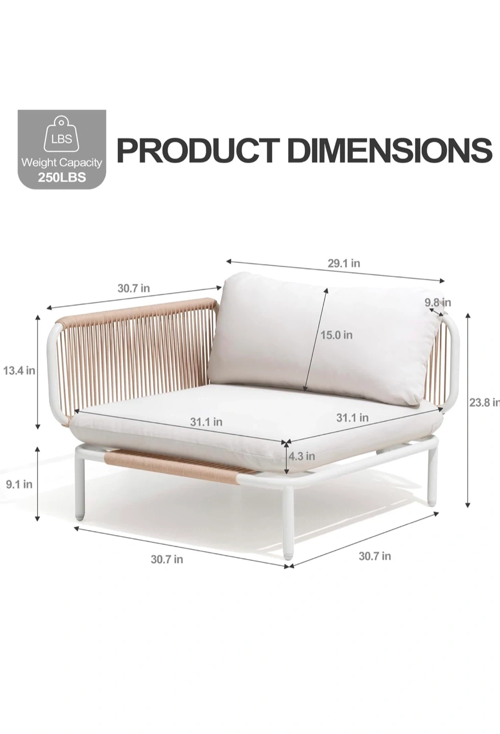 This modern outdoor lounge chair is perfect for relaxing! It features a sturdy metal frame and is crafted with 100% Olefin fabric and premium D5 Tes Rope. The cushion is made with high rebound foam for lasting comfort and luxurious softness. The chair measures approximately 30.7 x 30.7 x 23.8 inches.