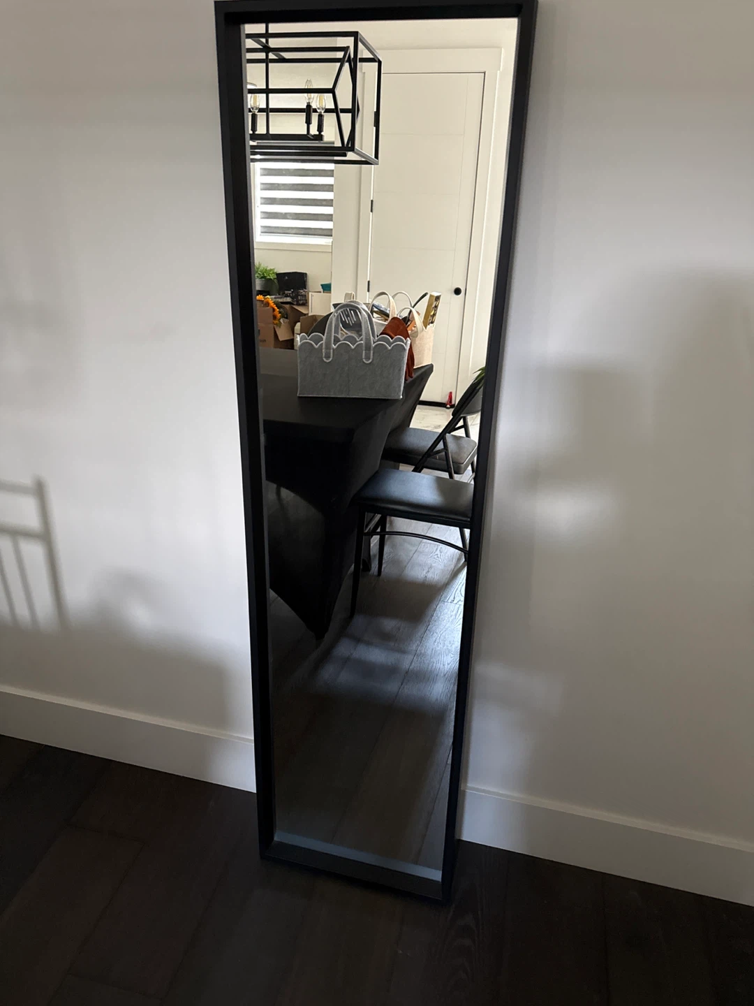 A tall, rectangular mirror with a sleek black frame. It's perfect for checking your full outfit before heading out. The frame is made of a durable material. There are two mirrors. $100 for both. 16x60
