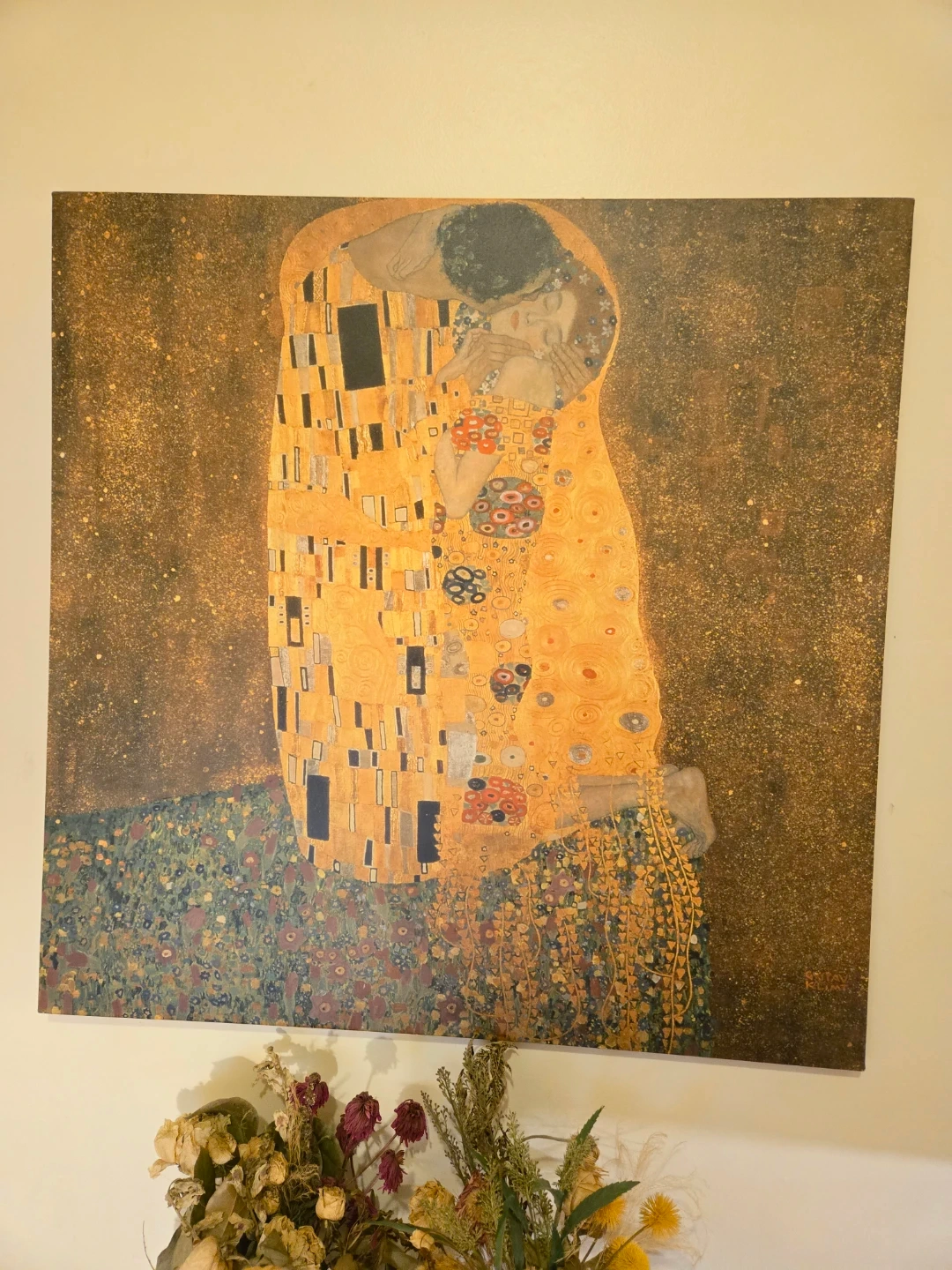 This is a reproduction of Gustav Klimt's iconic painting, 'The Kiss'. It features the famous couple embracing, rendered in gold leaf and ornate patterns. The artwork is a canvas print and is an impressive piece at 35.5" × 35.5"