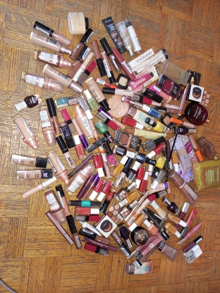 A LARGE collection of makeup items including foundations, lipsticks, nail polishes, and various other cosmetics.