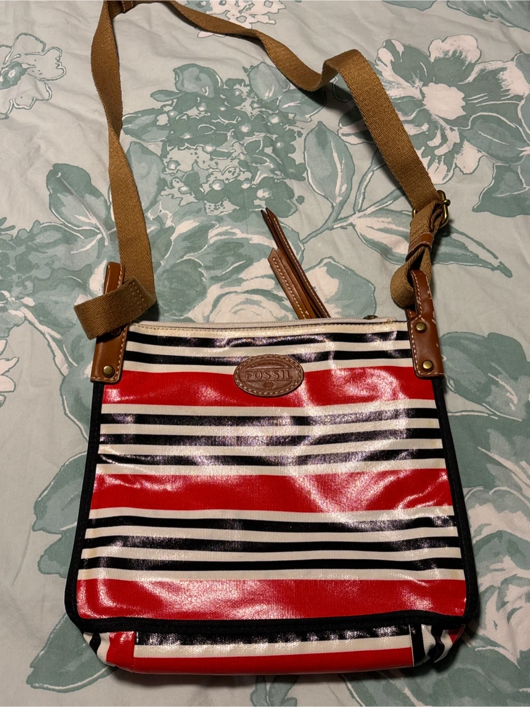 This Fossil crossbody bag features a red, white, and black stripe pattern. It has a canvas strap and leather accents. The bag is made of a shiny, durable material.