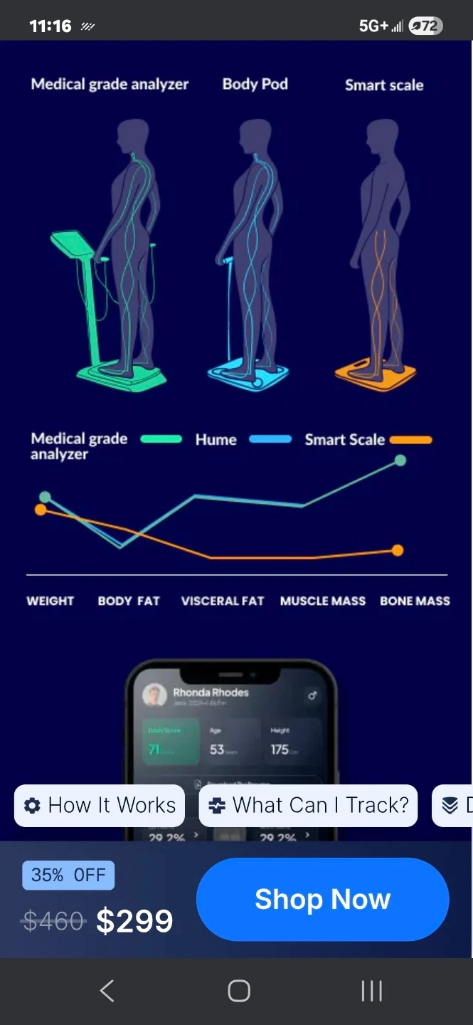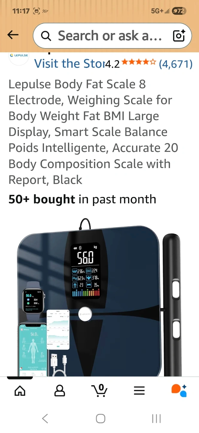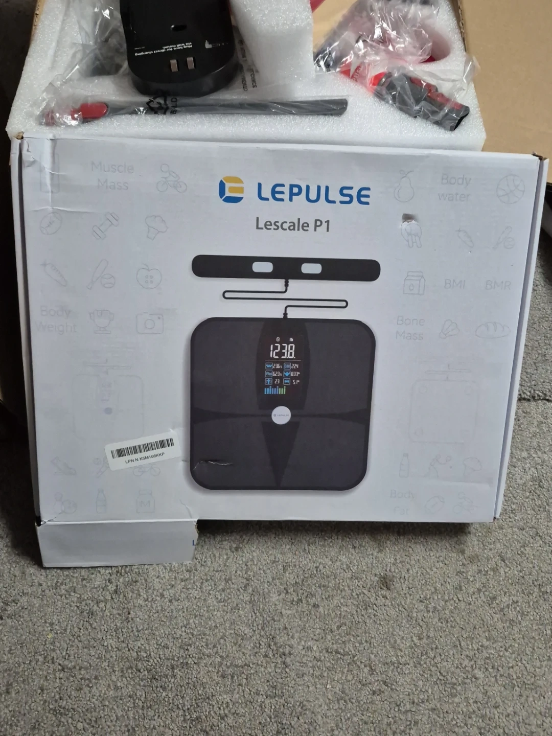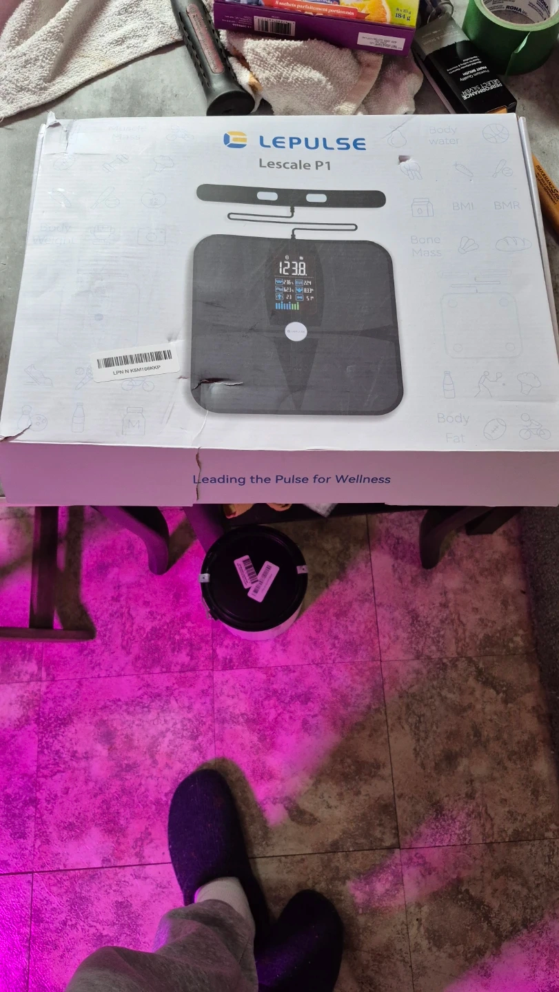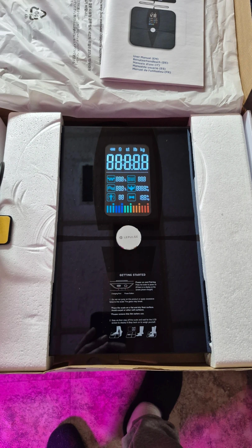 This LEPULSE Lescale P1 smart scale tracks body weight, fat, BMI, and more. It comes in a sleek black design. Includes original box and user manual.PRECISION BODY POD SCALE: Unlike other 4 electrode body weight scales for people, which only measure half of the body, Lepulse rechargeable body scale comprehensively measure 5 segmental of your body (4 limbs and torso) for 8-electrode Dual-frequency BIA technique. ITO coated sensor area fits all foot size