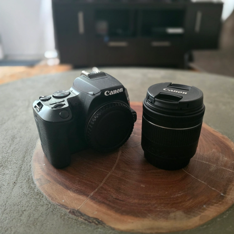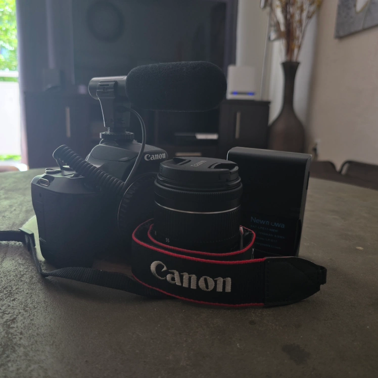 Selling a Canon EOS Rebel SL3 camera. It's in great condition and ready for a new home. Comes with a lens and a microphone. and two batteries