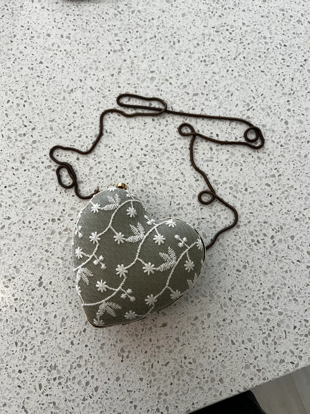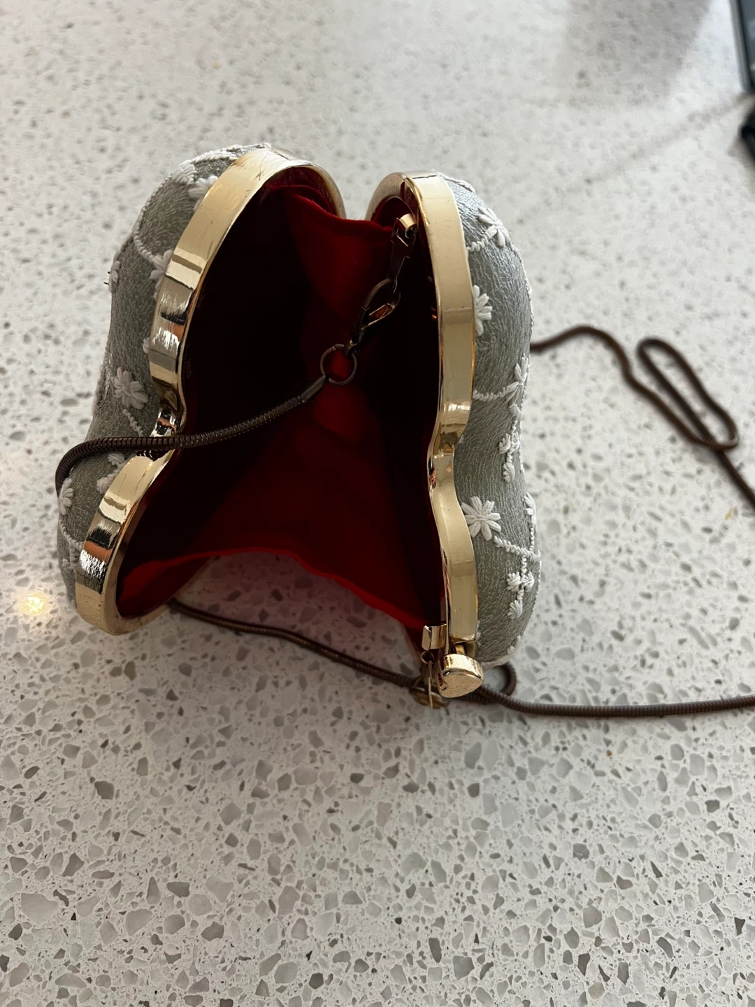 This is a cute heart-shaped clutch purse with delicate white floral embroidery. It features a gold-tone frame and long chain which is a little rusty but can be replaced. The interior is lined with red fabric.