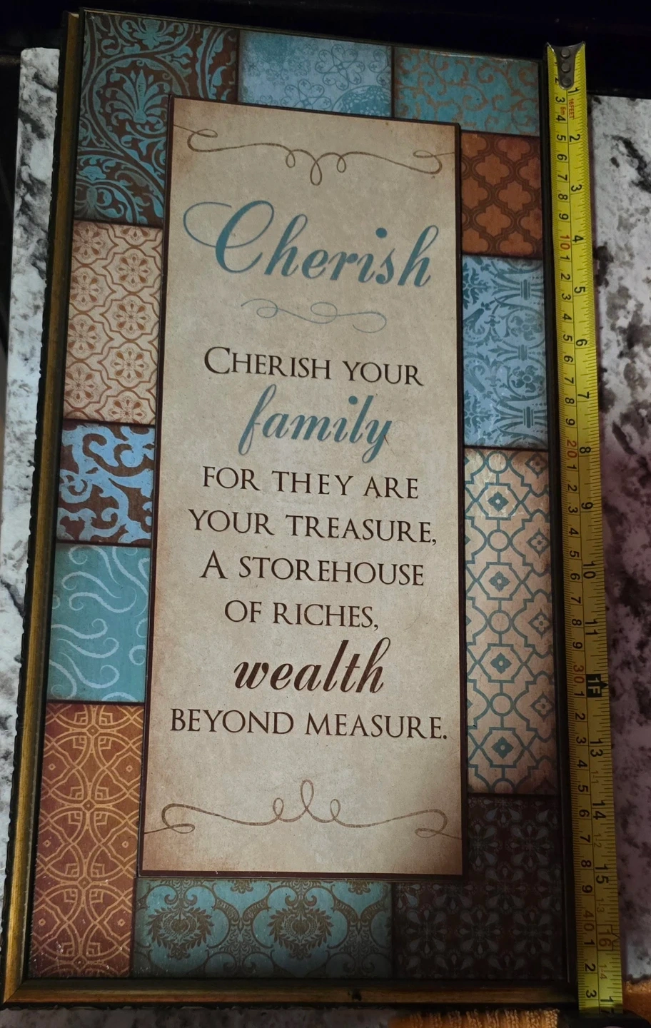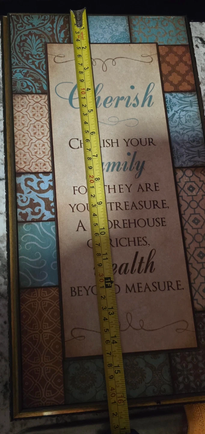 This decorative wall plaque features the inspirational quote, "Cherish your family for they are your treasure, a storehouse of riches, wealth beyond measure." It's framed with a distressed wood-look border and decorative tile accents. Dimensions are approximately 16 inches tall by 10 inches wide.