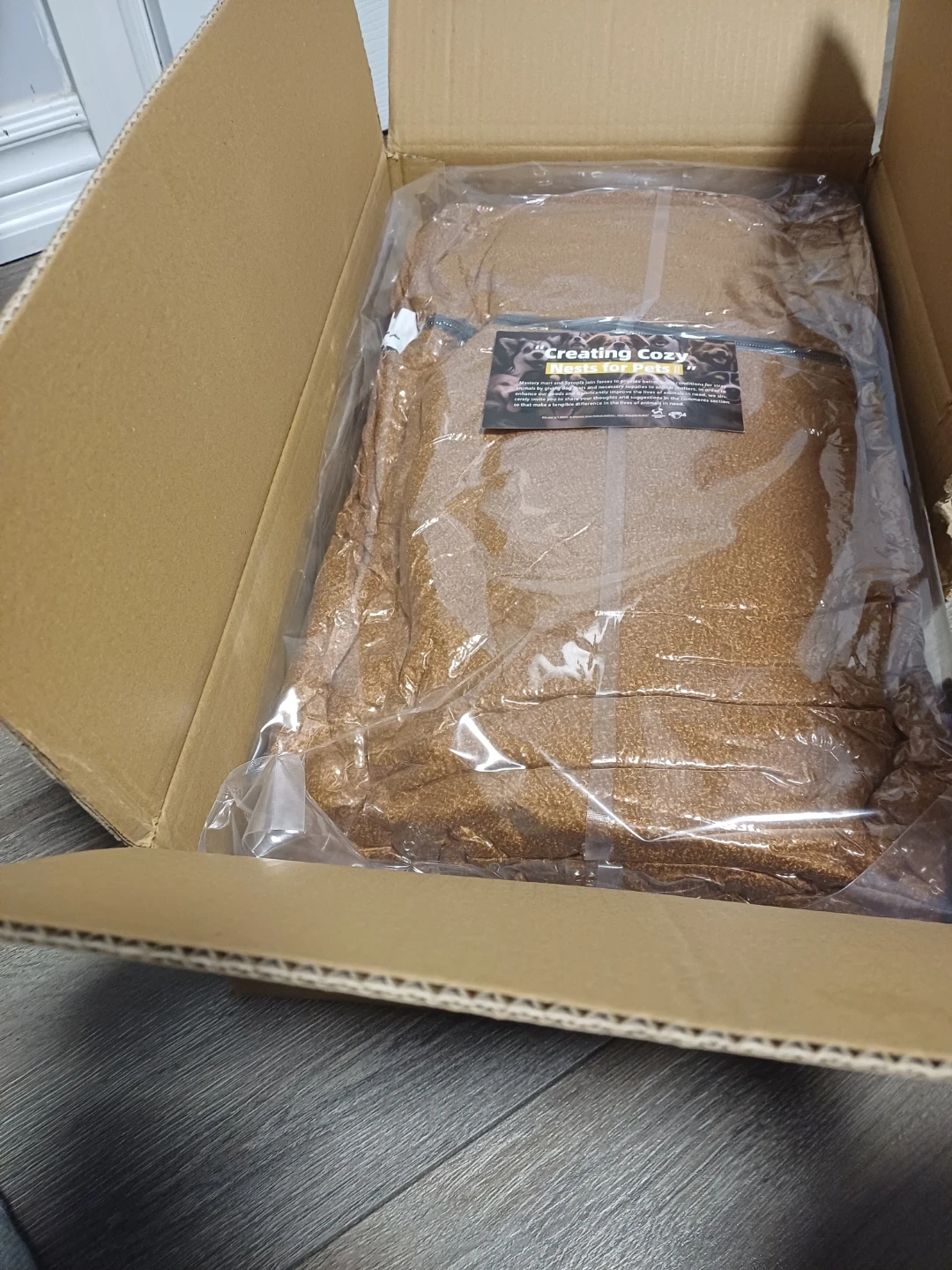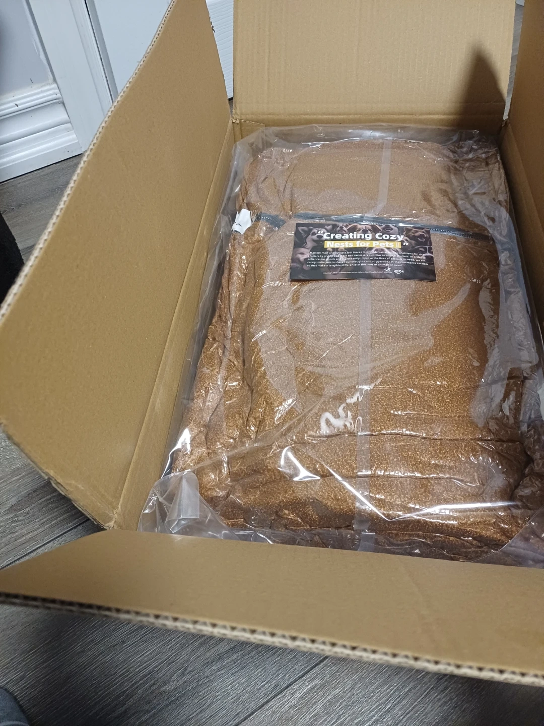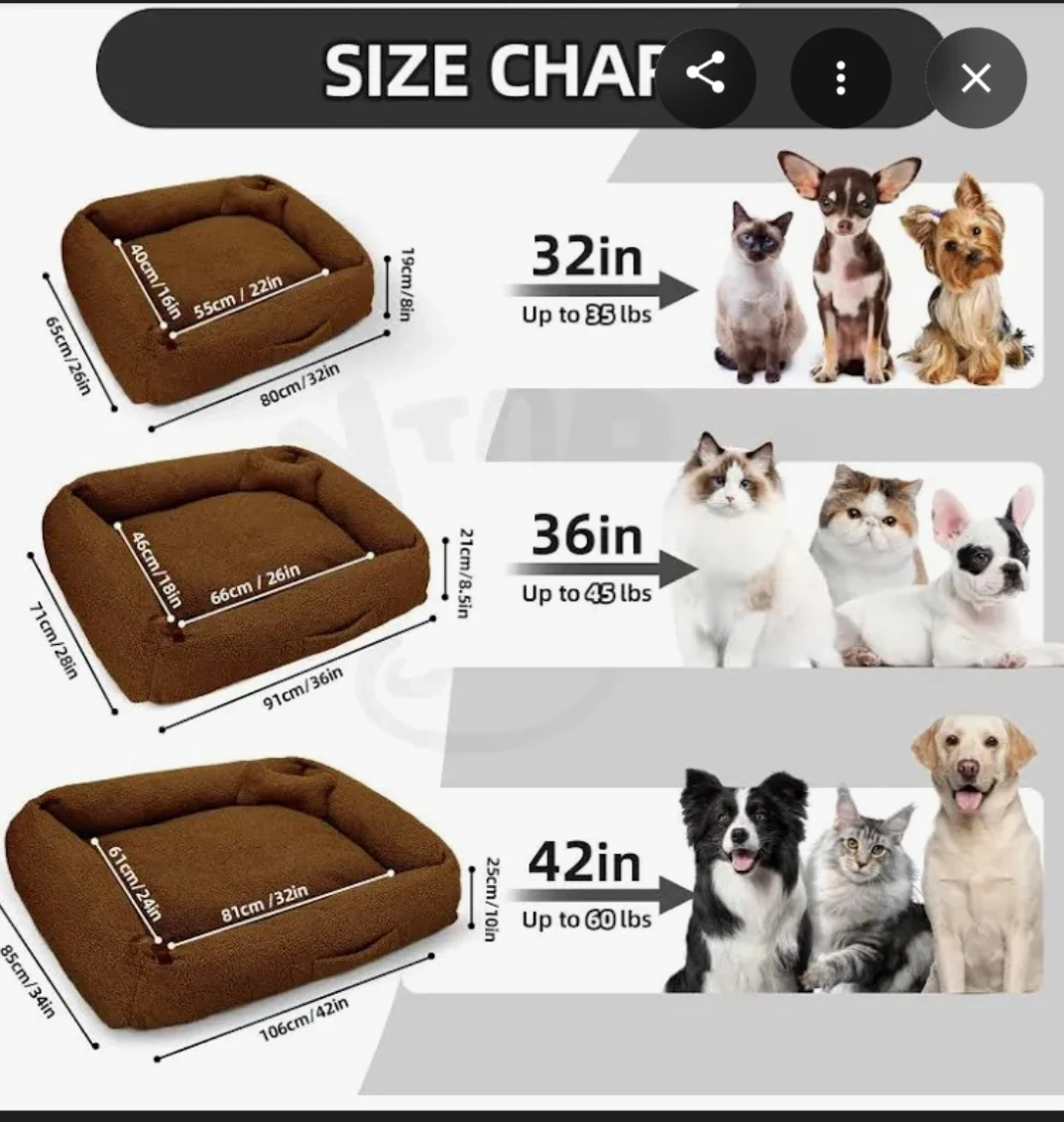This cozy pet bed which is a lovely brown colour. It's approxinately 42-inch bed, perfect for larger dogs. The plush material will keep your pet comfortable!