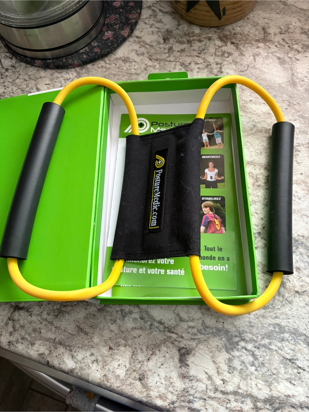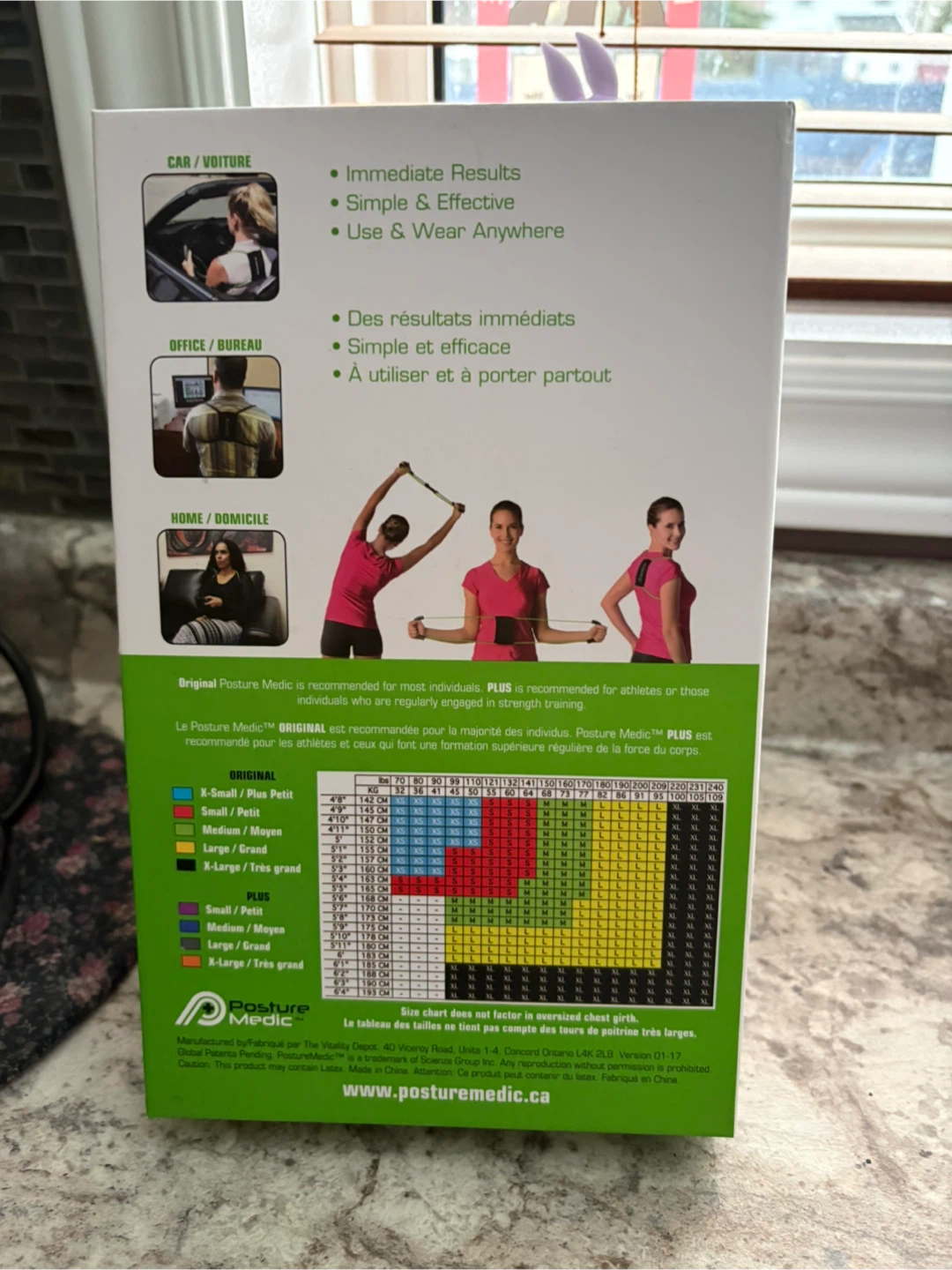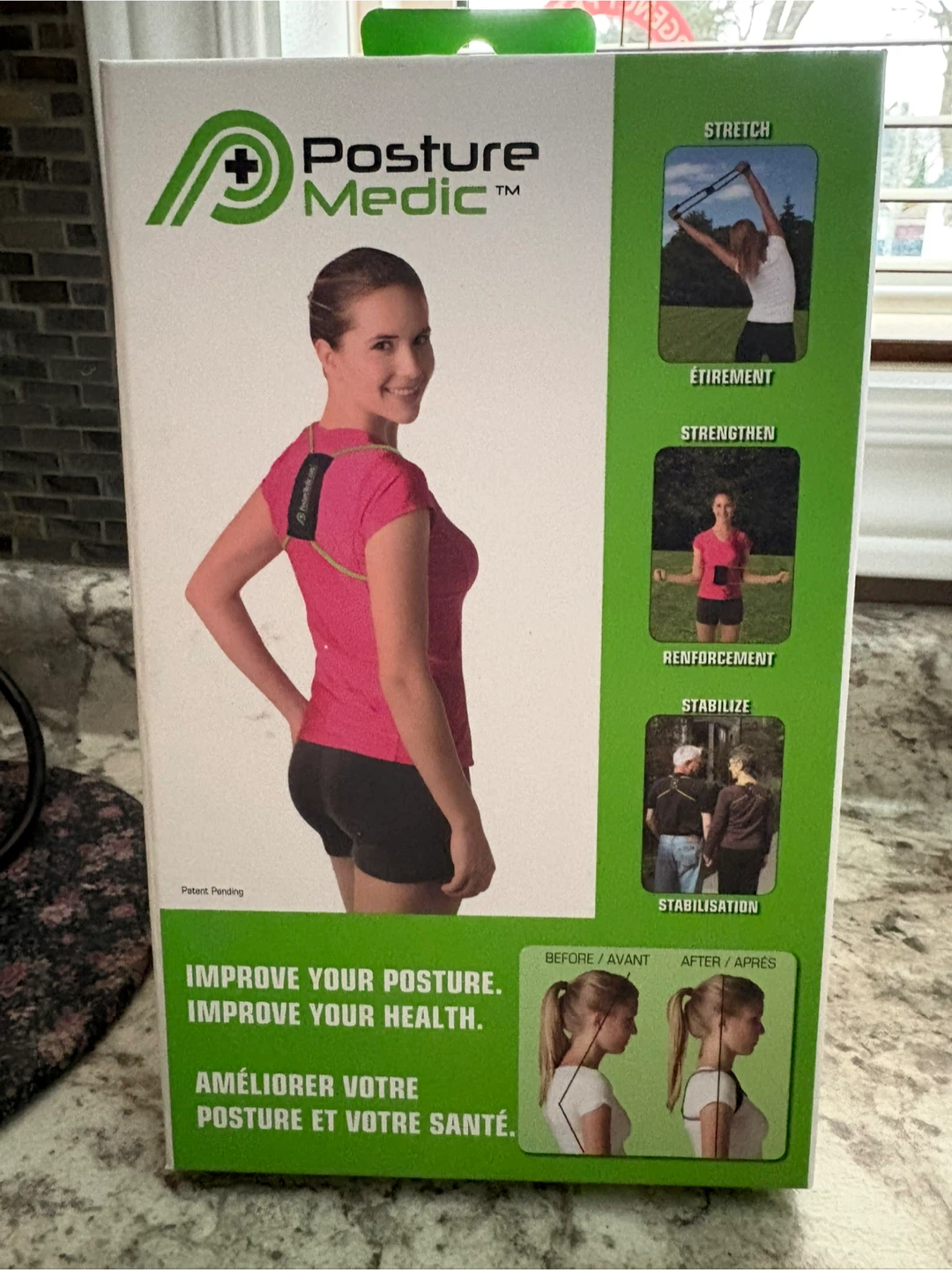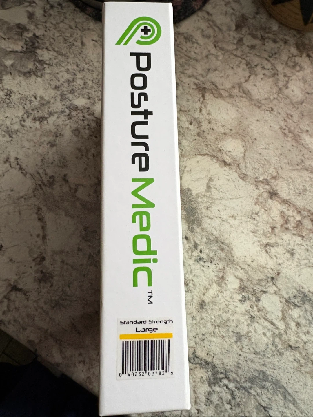 Posture Medic helps you improve your posture and overall health! The box says it's designed for athletes or those regularly engaged in strength training. It's simple and effective, and you can use it anywhere. This one is a size Large and comes with the original box! Used only once and from a smoke free home.