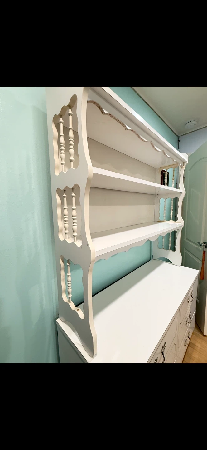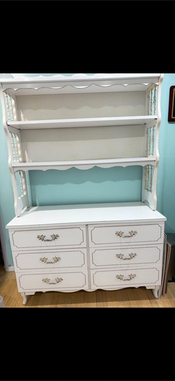 This white dresser features six drawers with decorative hardware and a hutch with three shelves. It's perfect for storing clothes or displaying decor. The piece has a classic design with some vintage flair. large dresser and small dresser for sale $150 total large Dresser measures 48“ x 18“ x 30“ . detachable bookshelf/hutch measures 48“ long x 11“ wide.x 46” tall