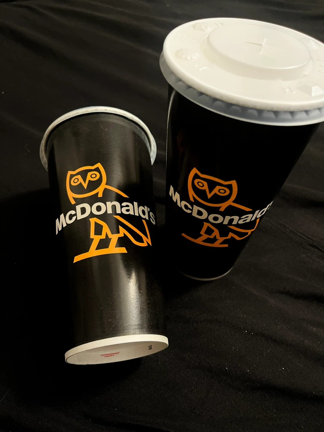 Two black paper cups featuring the McDonald's and OVO owl logo. These collectible cups are perfect for fans of both brands. Great for display or use!