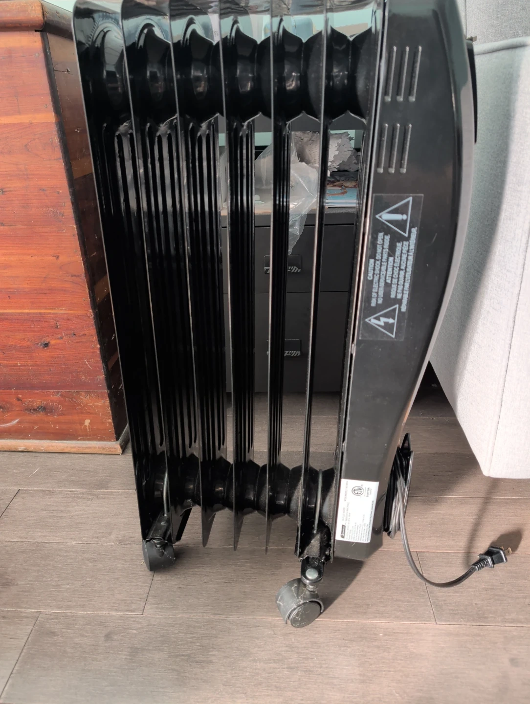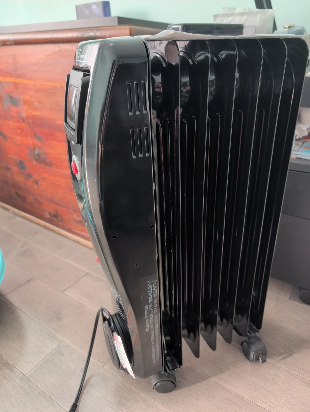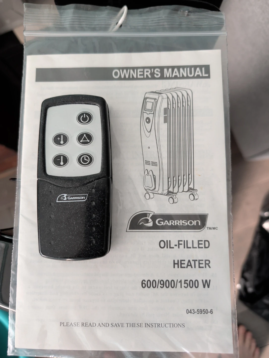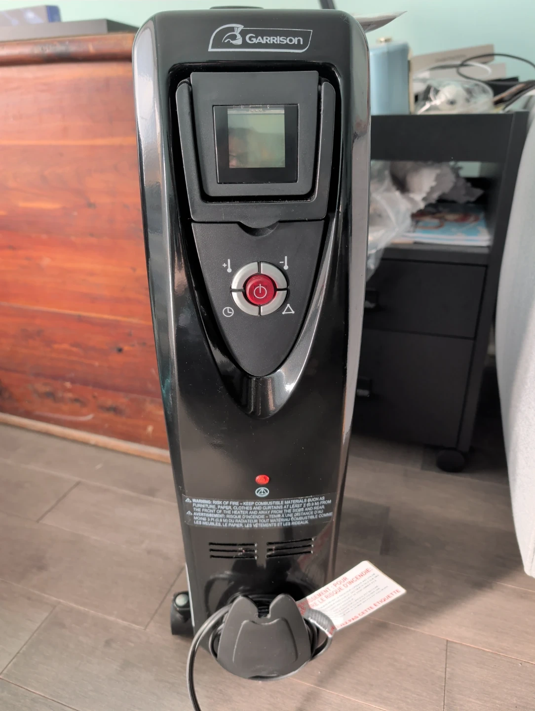 Garrison oil-filled heater with 600/900/1500W settings. It has an adjustable thermostat and includes a remote. This heater is black and has wheels for easy movement.