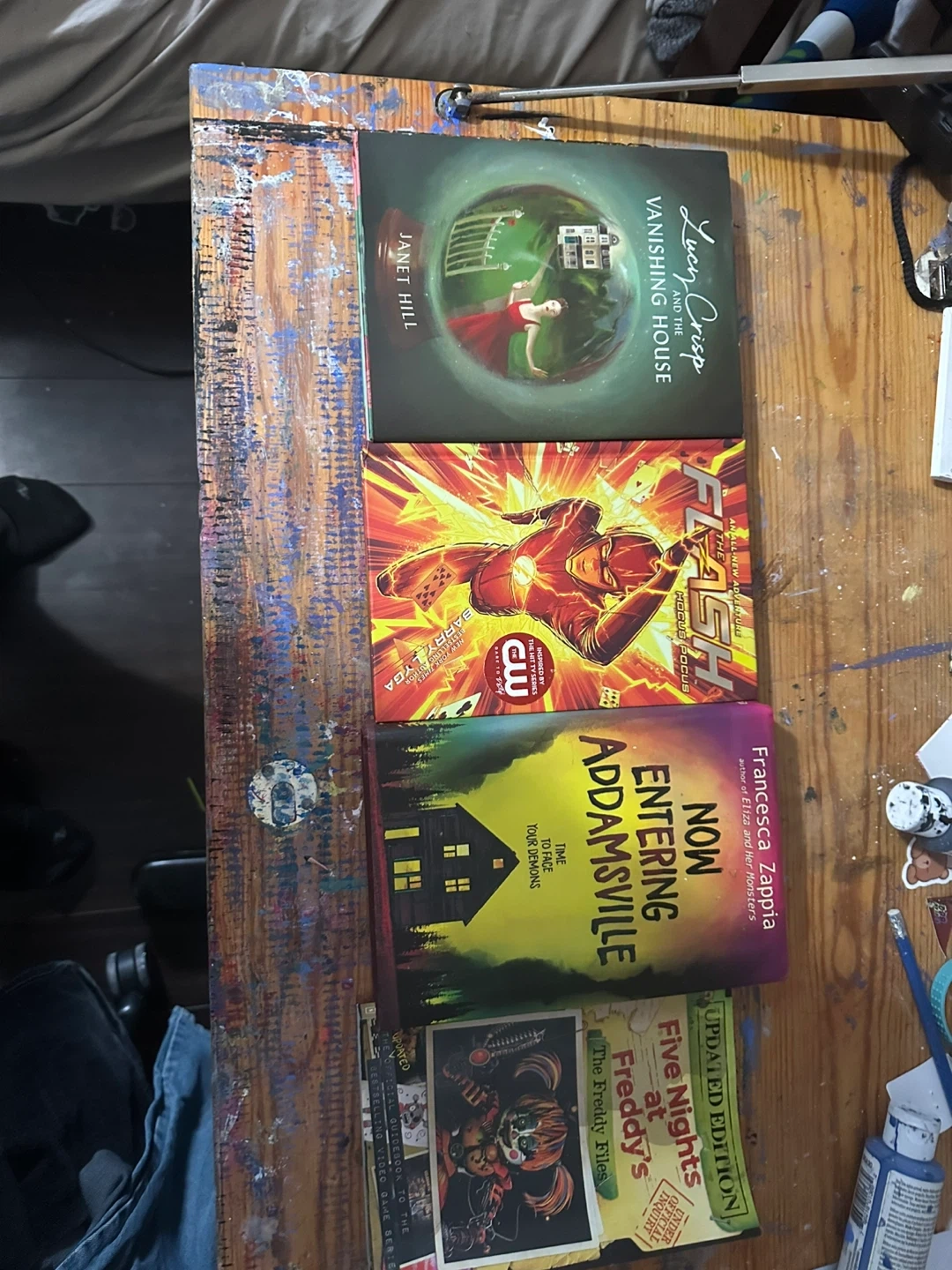 Includes 'Lucy Crisp and the Vanishing House' by Janet Hill and 'Now Entering Addamsville' by Francesca Zappia. Also features 'The Flash' graphic novel and 'Five Nights at Freddy's: The Fourth Closet' by Scott Cawthon & Elley Cooper. These books are great for young adult readers who enjoy mystery and adventure.