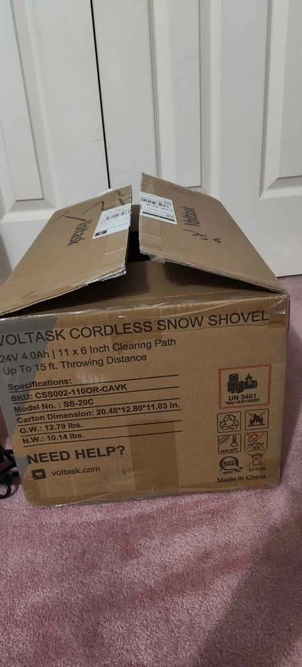 BRAND New Open Box, unused. I got this a few days ago but found out it was too small for my driveway. VOLTASK (SS-20C) 24V 11-inch Cordless Snow Shovel with Adjustable Handle. This cordless snow blower weighs 7.3 pounds and can clear a path 11 inches wide and 6 inches deep. It's durable and reliable for home use. Powered by a detachable 24V 4Ah battery pack (included), enjoy 25 mins of continuous runtime. It recharges fully in 90 mins with the smart charger. Weighing only 7.3 lbs with dual adjustable handles, it reduces back strain. High-strength aluminum shaft and impact-resistant polymer housing withstand cold temperatures. Perfect for seniors, homeowners, and urban users. Clears snow from driveways, steps, patios, and sidewalks. Also great for clearing snow-packed cars and narrow walkways.