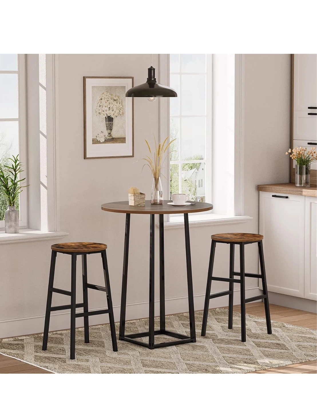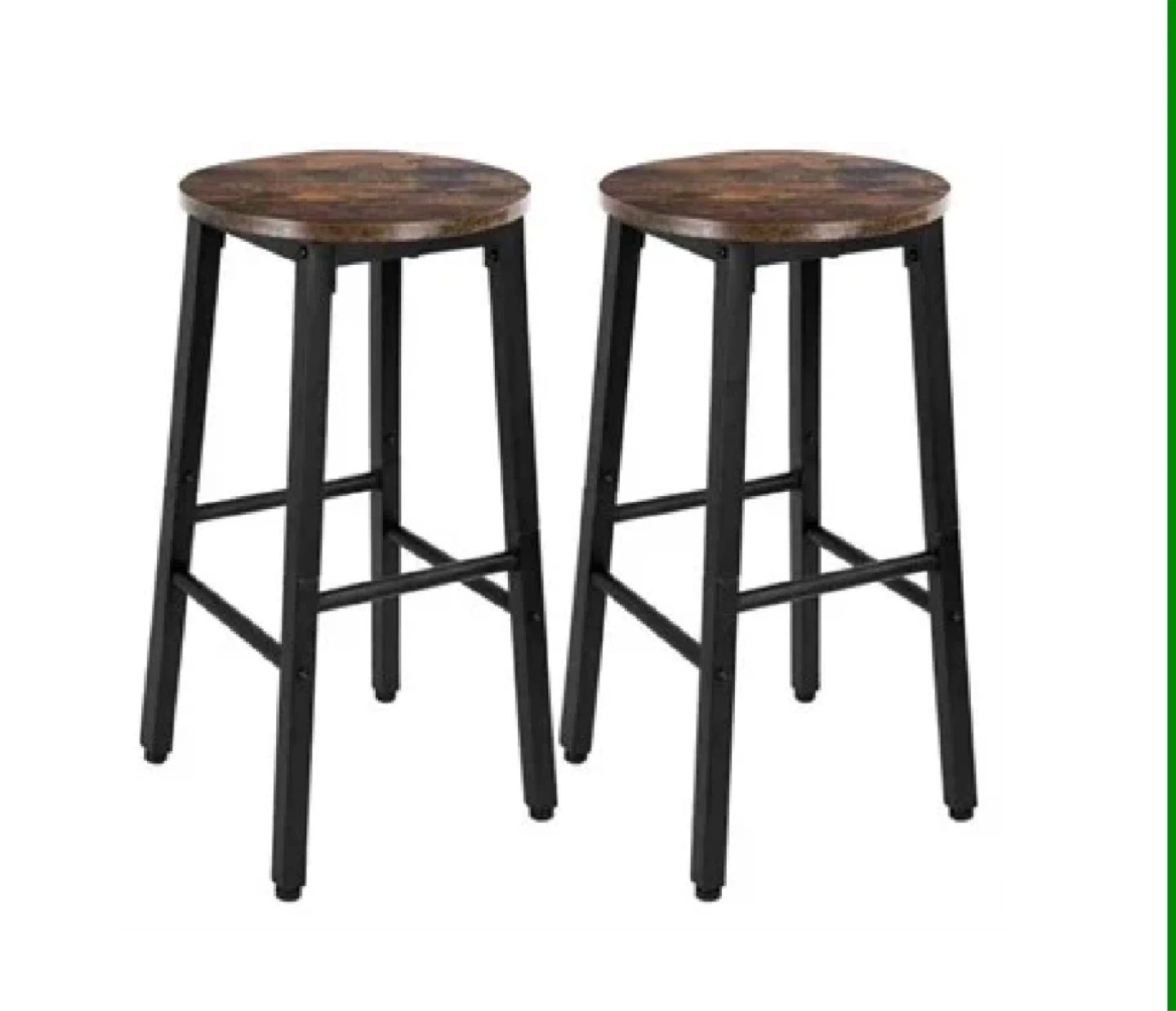 This set includes two round bar stools with a rustic brown wood-look seat and black metal frame. Each stool measures 32 cm in diameter and has a height of 63 cm. These stools are great for your kitchen or dining area!