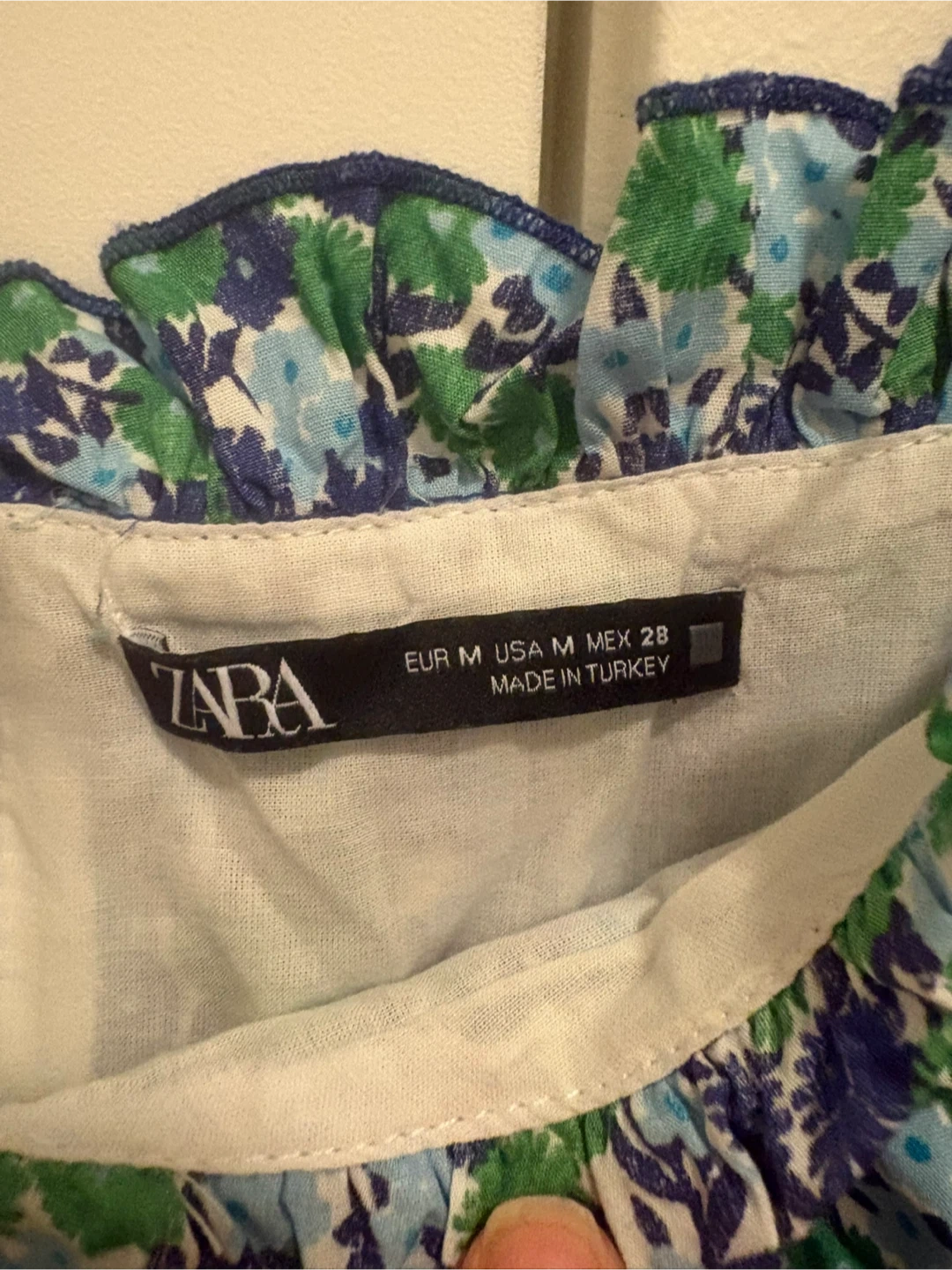 This is a Zara floral print puff sleeve top in size M. It features a blue and green floral pattern. Perfect for adding a pop of colour to your wardrobe!